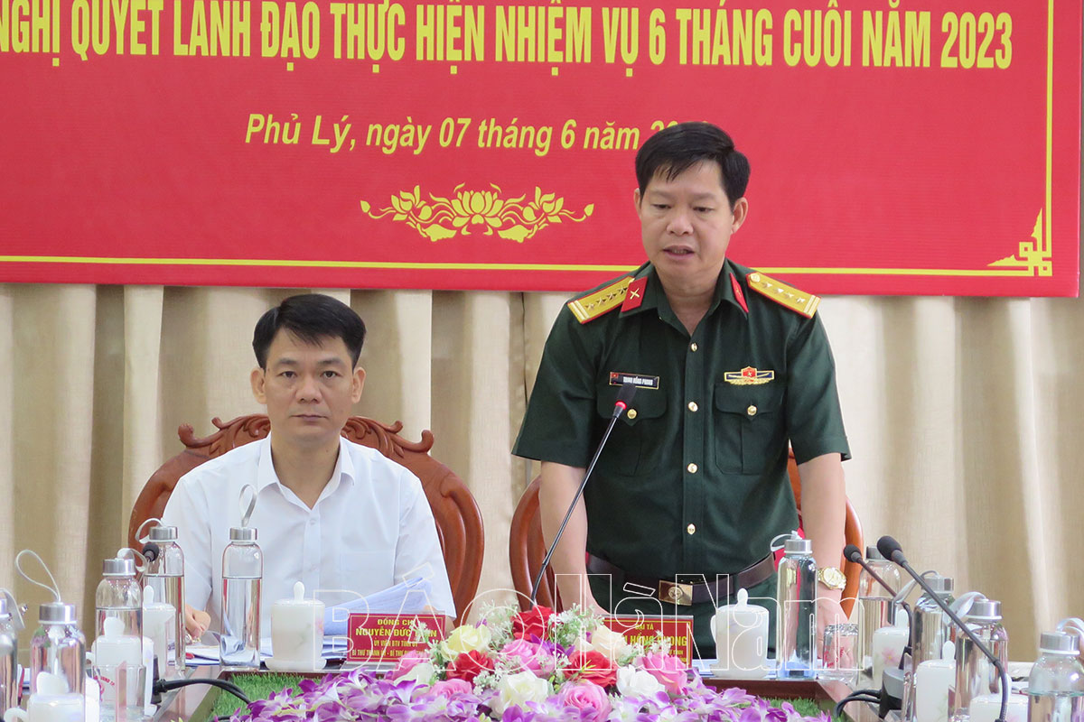 Sáng 7/6, Đảng ủy Quân sự (ĐUQS) thành phố Phủ Lý tổ chức hội nghị ra nghị quyết lãnh đạo thực hiện nhiệm vụ 6 tháng cuối năm 2023. Đồng chí Nguyễn Đức Toàn, Ủy viên BTV Tỉnh ủy, Bí thư Thành ủy, Bí thư ĐUQS thành phố chủ trì hội nghị. Đại tá Trịnh Hồng Phong, Uỷ viên Ban Thường vụ ĐUQS tỉnh, Phó Chỉ huy trưởng, Tham mưu trưởng Bộ CHQS tỉnh dự, chỉ đạo hội nghị.