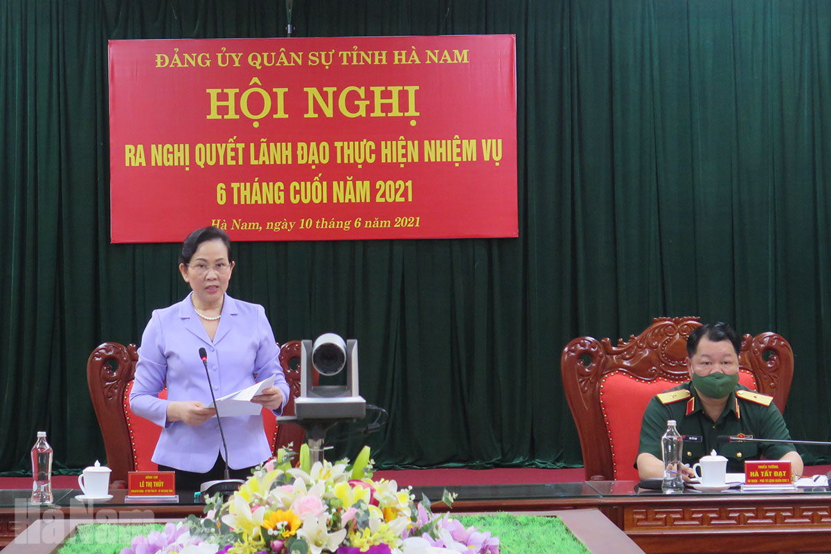Phát biểu kết luận hội nghị, đồng chí Lê Thị Thủy, Ủy viên Trung ương Đảng, Bí thư Tỉnh ủy, Bí thư ĐUQS tỉnh, Trưởng đoàn đại biểu Quốc hội tỉnh nhấn mạnh: từ nay đến hết năm 2021, tình hình dịch bệnh Covid-19 còn có thể diễn biến phức tạp, khó lường, ảnh hưởng lớn đến phát triển kinh tế - xã hội. Do vậy để hoàn thành thắng lợi nhiệm vụ QS, QPĐP, công tác xây dựng đảng bộ, LLVT và nhiệm vụ phòng, chống dịch…cấp ủy, tổ chức đảng các cấp cần đề cao tinh thần, trách nhiệm, lãnh đạo, chỉ đạo, tổ chức thực hiện thắng lợi các mục tiêu, chỉ tiêu nghị quyết năm 2021 đề ra.