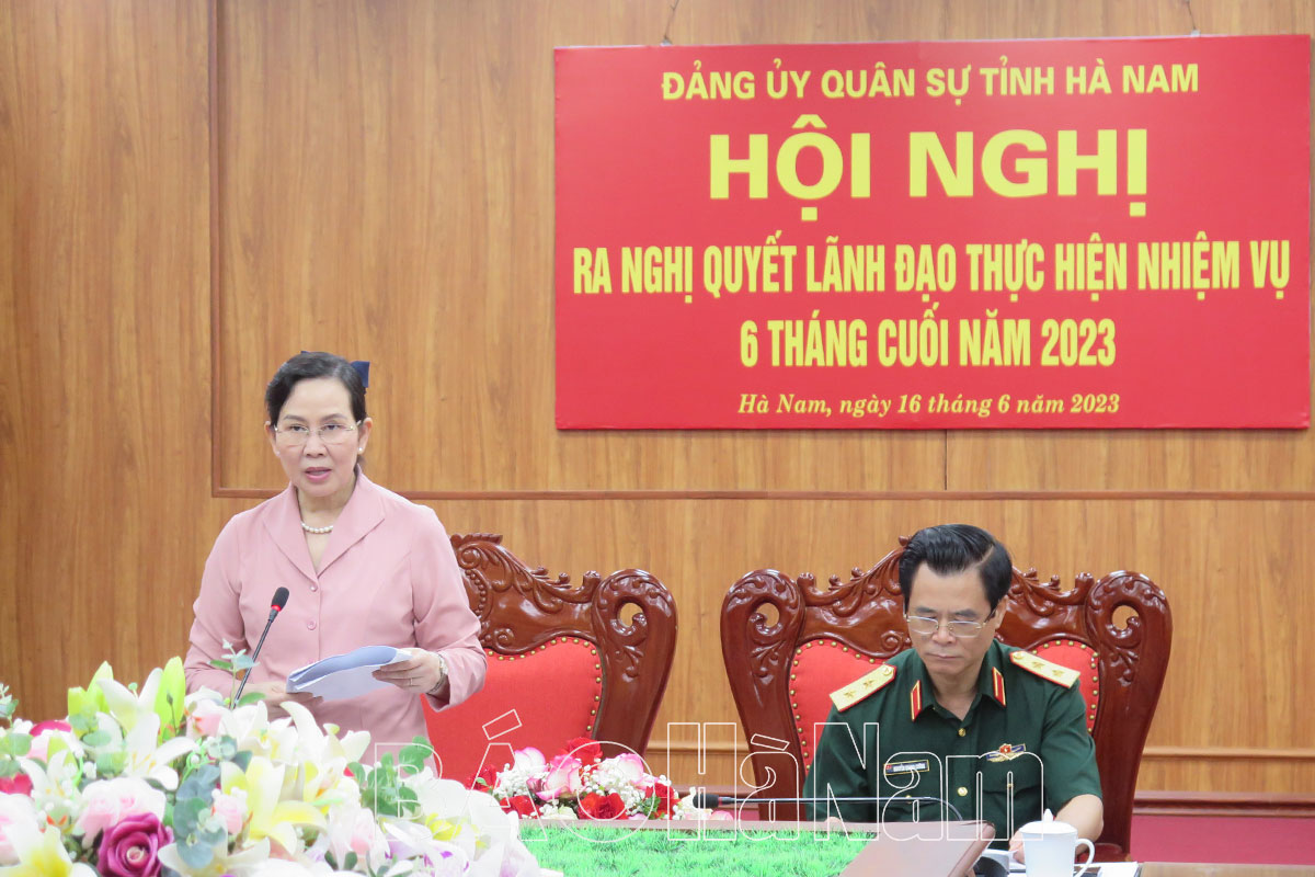 Phát biểu kết luận hội nghị, đồng chí Lê Thị Thuỷ, Uỷ viên Trung ương Đảng, Bí thư Tỉnh uỷ, Chủ tịch HĐND tỉnh, Bí thư Đảng uỷ Quân sự tỉnh đề nghị: 6 tháng cuối năm, Đảng uỷ lãnh đạo thực hiện tốt công tác QP-QSĐP. Trong đó, tập trung lãnh đạo, chỉ đạo làm tốt công tác chuẩn bị tham gia diễn tập KVPT Quân khu 3; tham mưu giúp Tỉnh uỷ, UBND tỉnh làm tốt công tác chuẩn bị diễn tập KVPT tỉnh năm 2023; chỉ đạo tổ chức tốt cuộc diễn tập cấp huyện, sở, ngành, xã, phường, thị trấn. Đẩy nhanh tiến độ xây dựng sở chỉ huy diễn tập tỉnh, trường bắn, thao trường huấn luyện phục vụ diễn tập KVPT tỉnh và các công trình quân sự trong KVPT cấp tỉnh, cấp huyện đã được phê duyệt; lãnh đạo làm tốt các bước trong quy trình tuyển quân năm 2024; nâng cao chất lượng huấn luyện, hội thi, hội thao, trình độ, khả năng SSCĐ, phòng chống thiên tai, tìm kiếm cứu nạn trong LLVT; nắm chắc tình hình địa bàn, kịp thời tham mưu giải quyết tốt các vấn đề nảy sinh; thực hiện nghiêm quy định về tổ chức biên chế; nâng cao chất lượng, hiệu quả công tác tuyên truyền, giáo dục chính trị tư tưởng; duy trì đầy đủ lượng dự trữ vật chất hậu cần, kỹ thuật cho các nhiệm vụ theo quy định, nhất là nhiệm vụ diễn tập KVPT, huấn luyện SSCĐ, phòng chống thiên tai…; tiếp tục quán triệt thực hiện nghiêm các nghị quyết, chỉ thị của cấp trên về công tác xây dựng Đảng, xây dựng Đảng bộ Quân sự tỉnh trong sạch vững mạnh, hoàn thành thắng lợi mọi nhiệm vụ chính trị được giao.