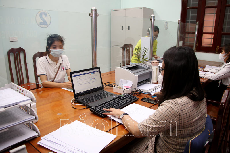 Nhân viên Bảo hiểm xã hội thị xã Duy Tiên giải quyết thủ tục cho người lao động hưởng hỗ trợ theo Nghị quyết 116