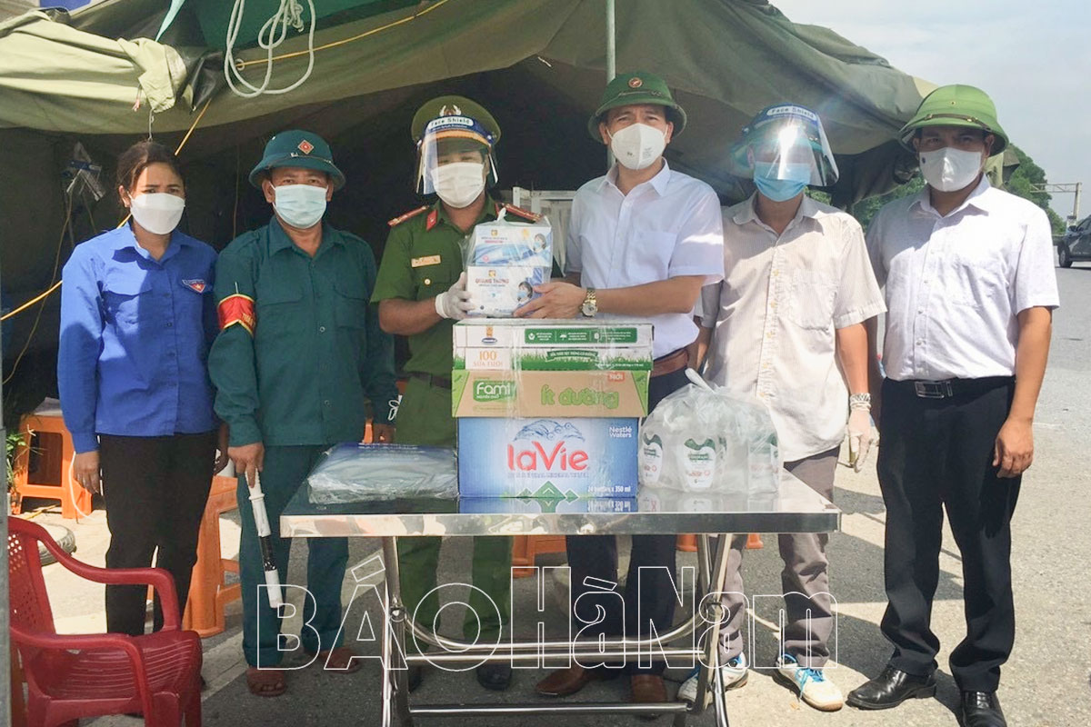 Lãnh đạo Phòng GD&ĐT thị xã Duy Tiên tặng quà lực lượng chức năng tại các chốt kiểm dịch trên địa bàn có sự tham gia của nhân viên ngành giáo dục.