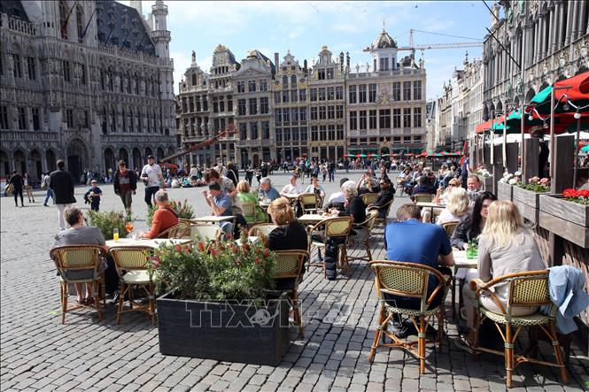 Thực khách thưởng thức cà phê ngoài trời, khi các cửa hàng được phép mở cửa trở lại sau 7 tháng giãn cách nhằm chống dịch COVID-19, tại Brussels, Bỉ ngày 9/5/2021.