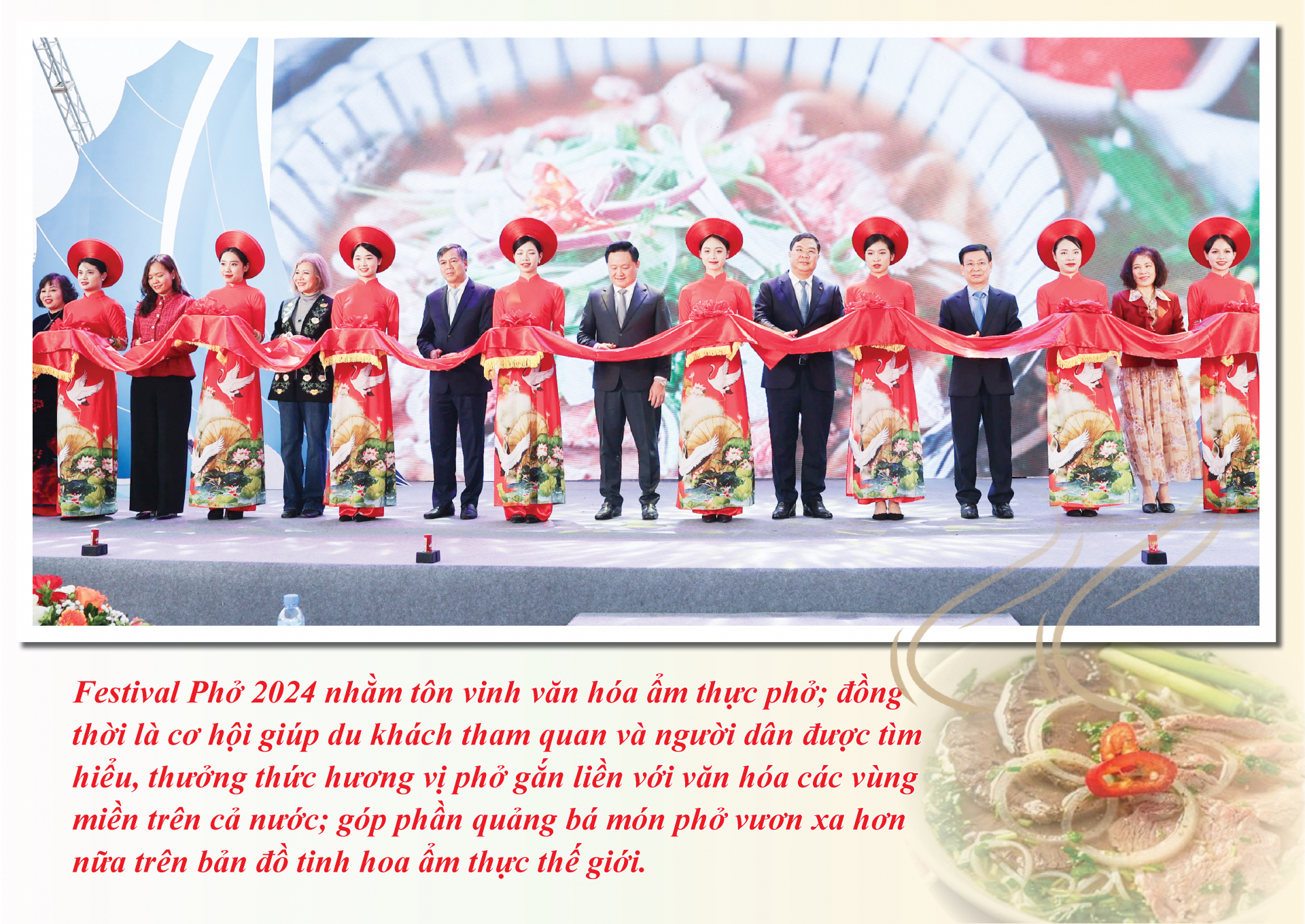 Phở là món ăn truyền thống lâu đời của người Việt. Phở được nhiều đầu bếp, chuyên gia, các tạp chí quốc tế công nhận là một trong số các món ăn hấp dẫn trên toàn cầu. Món ăn này ngày càng thu hút đông đảo thực khách trong và ngoài nước bởi những mỹ vị riêng có. Để quảng bá, lan toả các giá trị của phở Việt, trong các ngày từ 15 đến 17-3, tại thành phố Nam Định đã chính thức diễn ra Festival Phở 2024 với chủ đề: “Tôn vinh nghề phở, hướng tới di sản văn hoá phi vật thể”.
