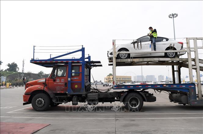 Công nhân vận hành xe chở ô tô con tại Công ty ô tô Trường An ở Trùng Khánh, Trung Quốc ngày 11/2/2020.