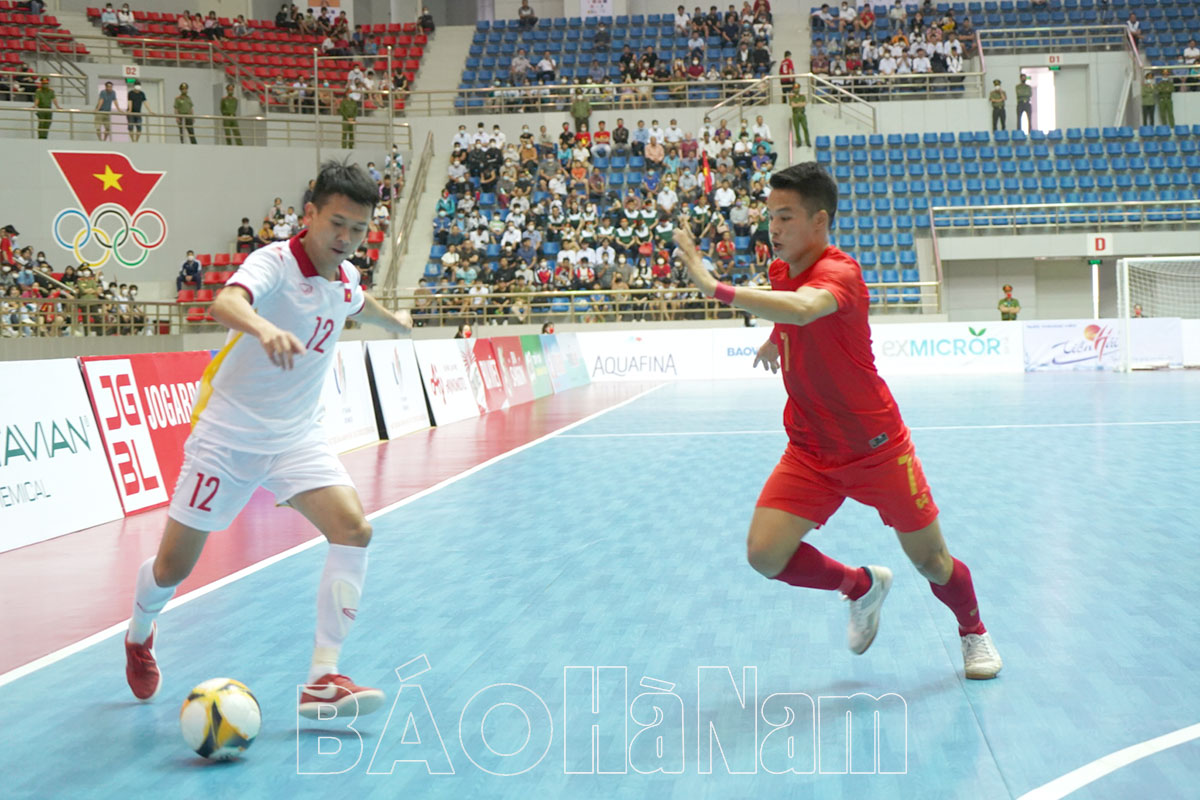 Tổ 2 của ĐT futsal Việt Nam vào sân. Số 6 Phạm Đức Hòa, Số 3 Lê Quốc Nam, Số 10 Nguyễn Thịnh Phát và số 13 Nhan Gia Hưng.