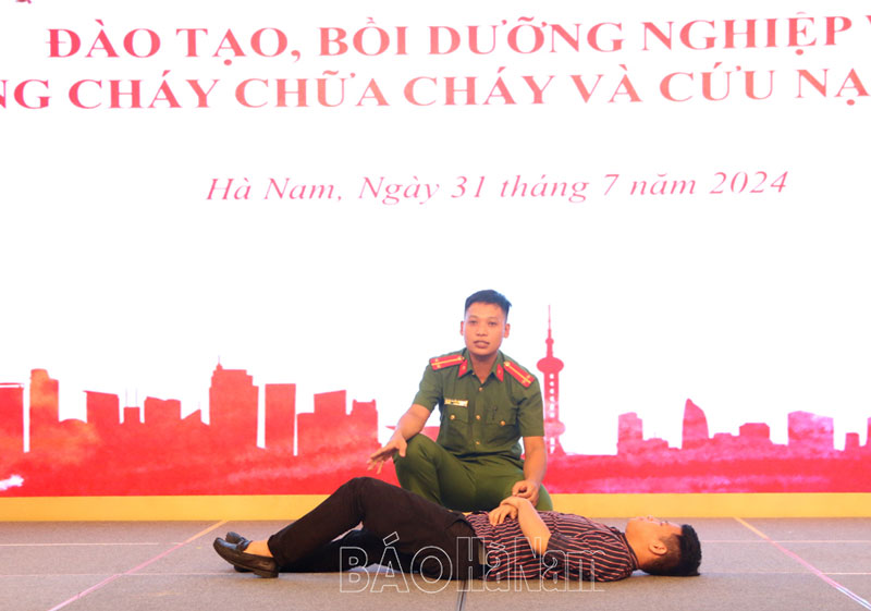 Chiều 31/7, Phòng Cảnh sát Phòng cháy, chữa cháy và cứu nạn, cứu hộ (PCCC&CNCH), Công an tỉnh phối hợp với Khách sạn Vicom Plaza Phủ Lý (Melia Vinpearl Phủ Lý) tổ chức tập huấn nghiệp vụ công tác PPCC&CNCH cho gần 100 cán bộ, nhân viên khách sạn.