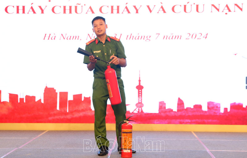 Cán bộ Phòng Cảnh sát PCCC&CNCH, Công an tỉnh hướng dẫn cách sử dụng bình chữa cháy cầm tay.