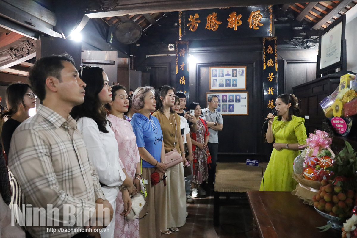 Đoàn famtrip nghe thuyết minh tại Nhà tưởng niệm Tổng Bí thư Trường Chinh, xã Xuân Hồng.