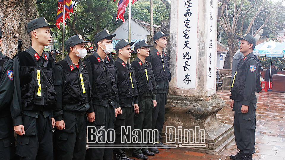 | Cán bộ, chiến sĩ Công an tỉnh tham gia đảm bảo an ninh trật tự khu vực cửa Đền Thiên Trường, Khu di tích Đền Trần. |