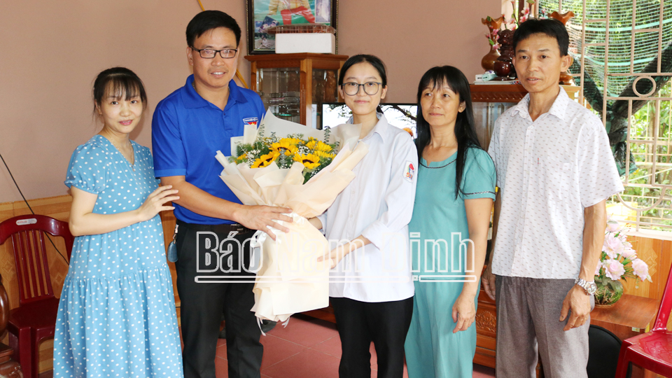 | BCH Đoàn Thanh niên Trường THPT Hoàng Văn Thụ (Vụ Bản) tặng hoa chúc mừng em Vũ Thị Vân Anh. |