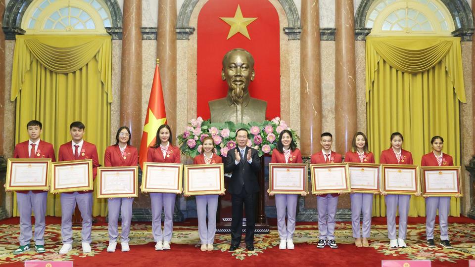 | Chủ tịch nước Võ Văn Thưởng trao tặng Huân chương Lao động hạng Nhì và hạng Ba cho các vận động viên có thành tích tại SEA Games 32. Ảnh: Thống Nhất/TTXVN |
