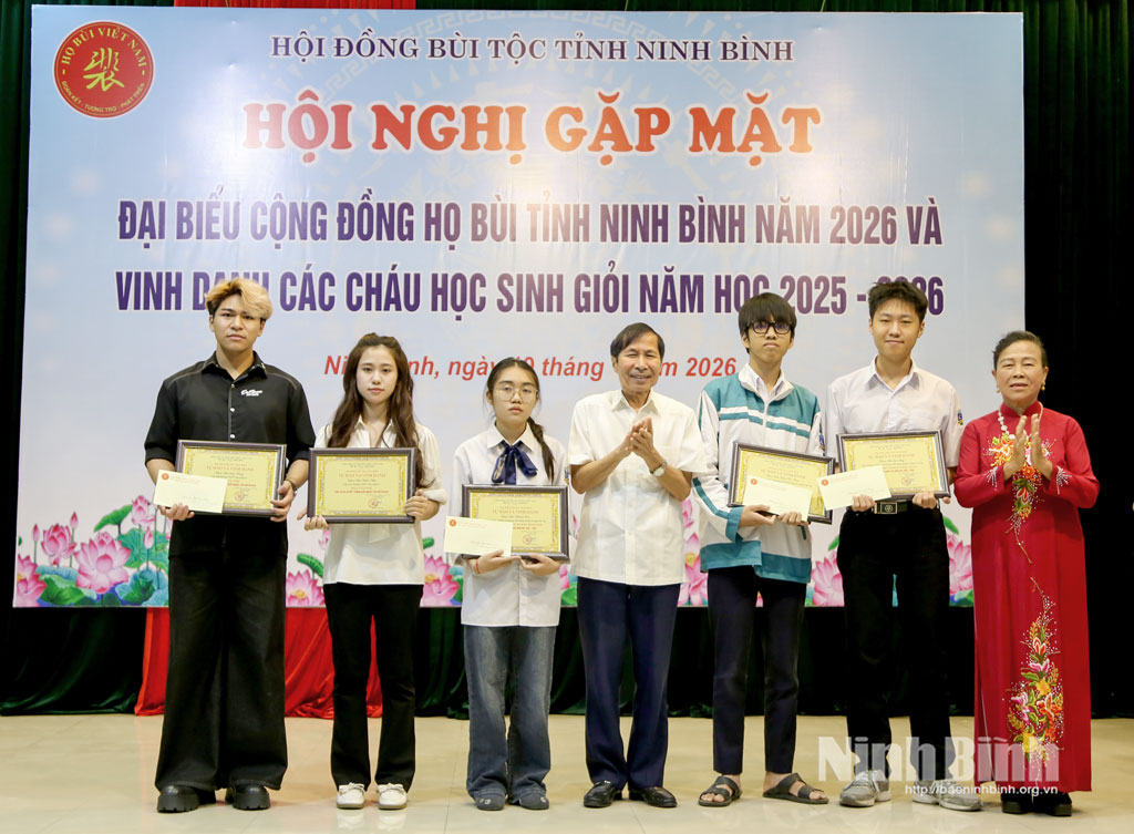 Nhân dịp này, Hội đồng Bùi tộc tỉnh Ninh Bình đã vinh danh, khen thưởng 94 em học sinh của dòng họ đạt giải cao trong các kỳ thi học sinh giỏi cấp tỉnh, cấp quốc gia năm học 2025-2026, với tổng số tiền thưởng gần 50 triệu đồng.