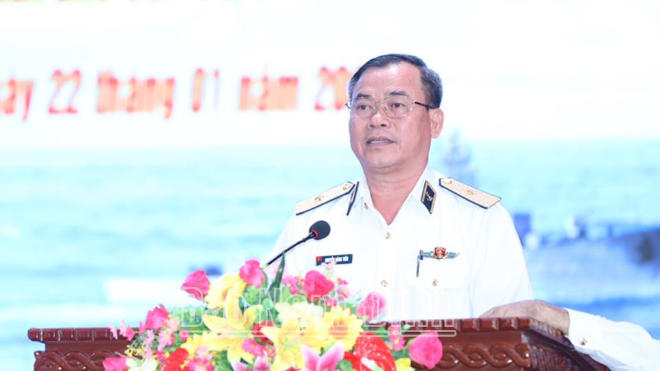 | Chuẩn Đô đốc Nguyễn Đăng Tiến, Chính ủy Bộ Tư lệnh Vùng 3 Hải quân phát biểu tại hội nghị. |