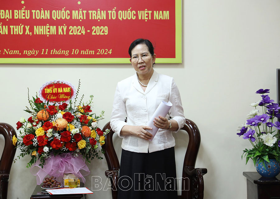 Phát biểu tại buổi gặp mặt, đồng chí Bí thư Tỉnh ủy Lê Thị Thủy nhấn mạnh, Đại hội đại biểu MTTQ Việt Nam lần thứ X, nhiệm kỳ 2024 - 2029 là sự kiện có ý nghĩa chính trị quan trọng đối với đất nước. Vì vậy, đề nghị, các đại biểu tham dự hội nghị cần phát huy tinh thần trách nhiệm, chấp hành nguyên tắc, nội quy của đại hội; đồng thời, tập trung trí tuệ, nghiên cứu kỹ các văn kiện để tham gia đóng góp nhiều ý kiến thiết thực cho đại hội, góp phần vào thành công của Đại hội đại biểu toàn quốc MTTQ Việt Nam lần thứ X, nhiệm kỳ 2024 - 2029.