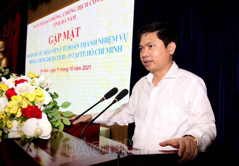 Phát biểu tại buổi gặp mặt, đồng chí Trương Quốc Huy, Phó Bí thư Tỉnh ủy, Chủ tịch UBND tỉnh, Trưởng đoàn ĐBQH tỉnh, Phó BCĐ, Chỉ huy trưởng Trung tâm Chỉ huy phòng, chống dịch bệnh Covid-19 tỉnh đã ghi nhận và biểu dương những đóng góp, cống hiến của đội ngũ cán bộ, nhân viên y tế tỉnh nhà trong cuộc chiến chống đại dịch Covid -19. Đồng chí khẳng định, với sự hỗ trợ đắc lực của các đoàn cán bộ nhân viên y tế của các tỉnh, thành phố trong cả nước, trong đó có Hà Nam, đến nay dịch bệnh tại TP HCM đã cơ bản được kiểm soát. Đồng chí Chủ tịch UBND tỉnh khuyến nghị, với kinh nghiệm đã tích lũy được trong quá trình hỗ trợ phòng chống dịch tại TP HCM, các thành viên trong đoàn sẽ tiếp tục hỗ trợ đắc lực cho Bệnh viện Dã chiến số 1 của tỉnh và các cơ sở khám chữa bệnh trên địa bàn tỉnh Hà Nam, sớm đưa tỉnh Hà Nam trở lại trạng thái bình thường mới.