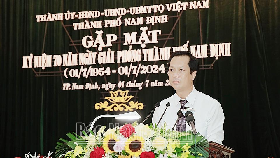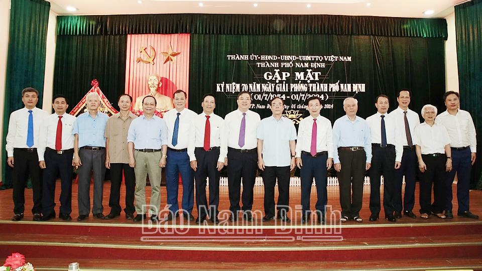 Chiều 1/7, Thành ủy - HĐND - UBND - Ủy ban MTTQ Việt Nam thành phố Nam Định tổ chức gặp mặt kỷ niệm 70 năm Ngày giải phóng thành phố Nam Định (01/7/1954 - 01/7/2024). Dự buổi gặp mặt có các đồng chí: Phạm Gia Túc, Ủy viên BCH Trung ương Đảng, Bí thư Tỉnh ủy; Lê Quốc Chỉnh, Phó Bí thư Thường trực Tỉnh uỷ, Chủ tịch HĐND tỉnh, Trưởng đoàn Đoàn đại biểu Quốc hội tỉnh; Phạm Đình Nghị, Phó Bí thư Tỉnh ủy, Chủ tịch UBND tỉnh; các đồng chí trong Ban TVTU; các đồng chí nguyên lãnh đạo chủ chốt của tỉnh, thành phố Nam Định qua các thời kỳ; các đồng chí cán bộ lão thành cách mạng, cán bộ tiền khởi nghĩa.
