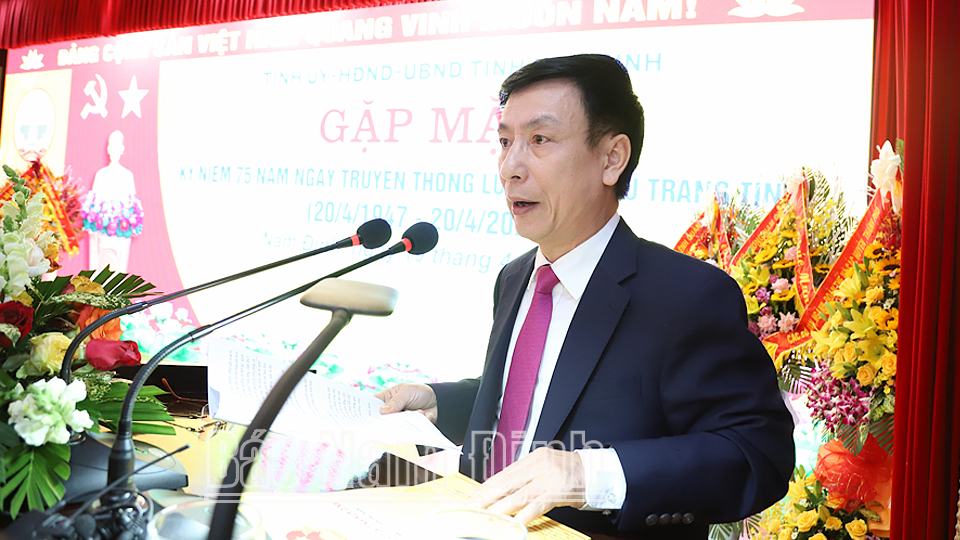 Tại lễ kỷ niệm, đồng chí Chủ tịch UBND tỉnh Phạm Đình Nghị đã trình bày diễn văn ôn lại truyền thống vẻ vang, anh hùng của LLVT tỉnh. Thực hiện Quyết định của Chính phủ, ngày 20-4-1947, Ban Chỉ huy Tỉnh đội Dân quân Nam Định nay là Bộ Chỉ huy Quân sự (CHQS) tỉnh Nam Định được thành lập và trực thuộc Ủy ban Kháng chiến tỉnh Nam Định. Trải qua 75 năm xây dựng, chiến đấu và trưởng thành, dưới sự lãnh đạo, chỉ đạo của Đảng ủy, Bộ Tư lệnh Quân khu 3, trực tiếp là Tỉnh ủy, HĐND, UBND tỉnh; sự phối hợp chặt chẽ của các cơ quan, ban, ngành, đoàn thể, LLVT tỉnh đã dũng cảm, kiên cường, vượt qua mọi khó khăn, thử thách, không ngừng lớn mạnh và trưởng thành, lập nhiều chiến công xuất sắc.
