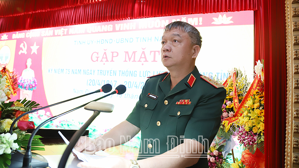 Phát biểu tại lễ kỷ niệm, Trung tướng Nguyễn Quang Ngọc, Tư lệnh Quân khu 3 đã ghi nhận, biểu dương những thành tích và chiến công vẻ vang của LLVT tỉnh. Đồng chí nhấn mạnh, để tiếp tục phát huy truyền thống và thành tích đạt được, thời gian tới LLVT tỉnh Nam Định tiếp tục tập trung thực hiện tốt một số nhiệm vụ trọng tâm: Tiếp tục xây dựng các tiềm lực của nền quốc phòng toàn dân vững mạnh, xây dựng khu vực phòng thủ tỉnh ngày càng vững chắc, đáp ứng yêu cầu nhiệm vụ bảo vệ Tổ quốc trong tình hình mới. Tiếp tục làm tốt chức năng tham mưu cho cấp ủy, chính quyền địa phương lãnh đạo, chỉ đạo hoàn thành toàn diện nhiệm vụ quốc phòng, quân sự địa phương hàng năm. Nâng cao chất lượng tổng hợp của LLVT tỉnh, phát huy vai trò nòng cốt xây dựng nền quốc phòng toàn dân vững mạnh. Đồng thời luôn giữ vững vai trò nòng cốt trong tham mưu và triển khai thực hiện nhiệm vụ phát triển KT-XH gắn với xây dựng và củng cố QPAN, đặc biệt là nhiệm vụ xây dựng nền quốc phòng toàn dân, thế trận quốc phòng toàn dân gắn với thế trận an ninh nhân dân vững chắc; phát huy phẩm chất “Bộ đội Cụ Hồ”, hoàn thành xuất sắc mọi nhiệm vụ được giao./.