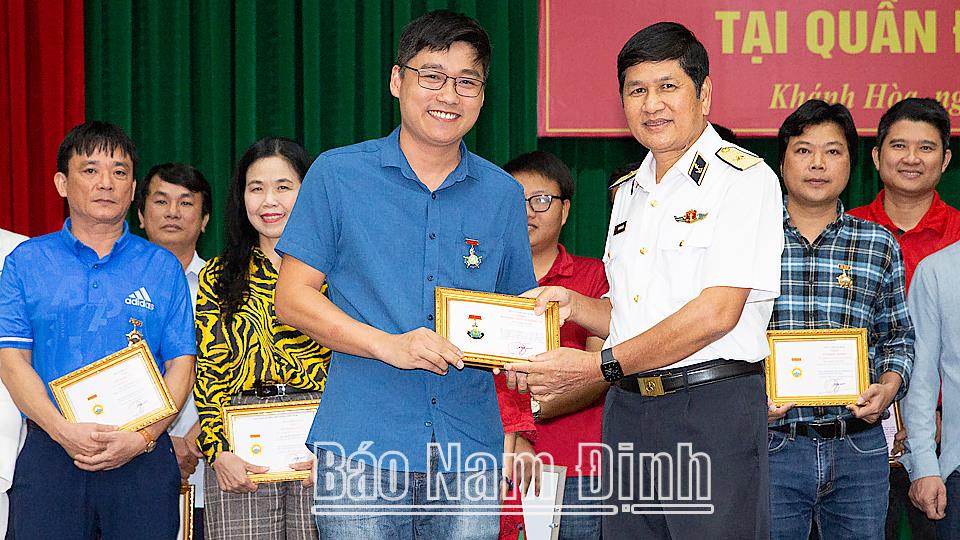 | Lãnh đạo Vùng 4 Hải quân trao huy hiệu chiến sĩ Trường Sa cho phóng viên Báo Nam Định tham gia đoàn công tác. |