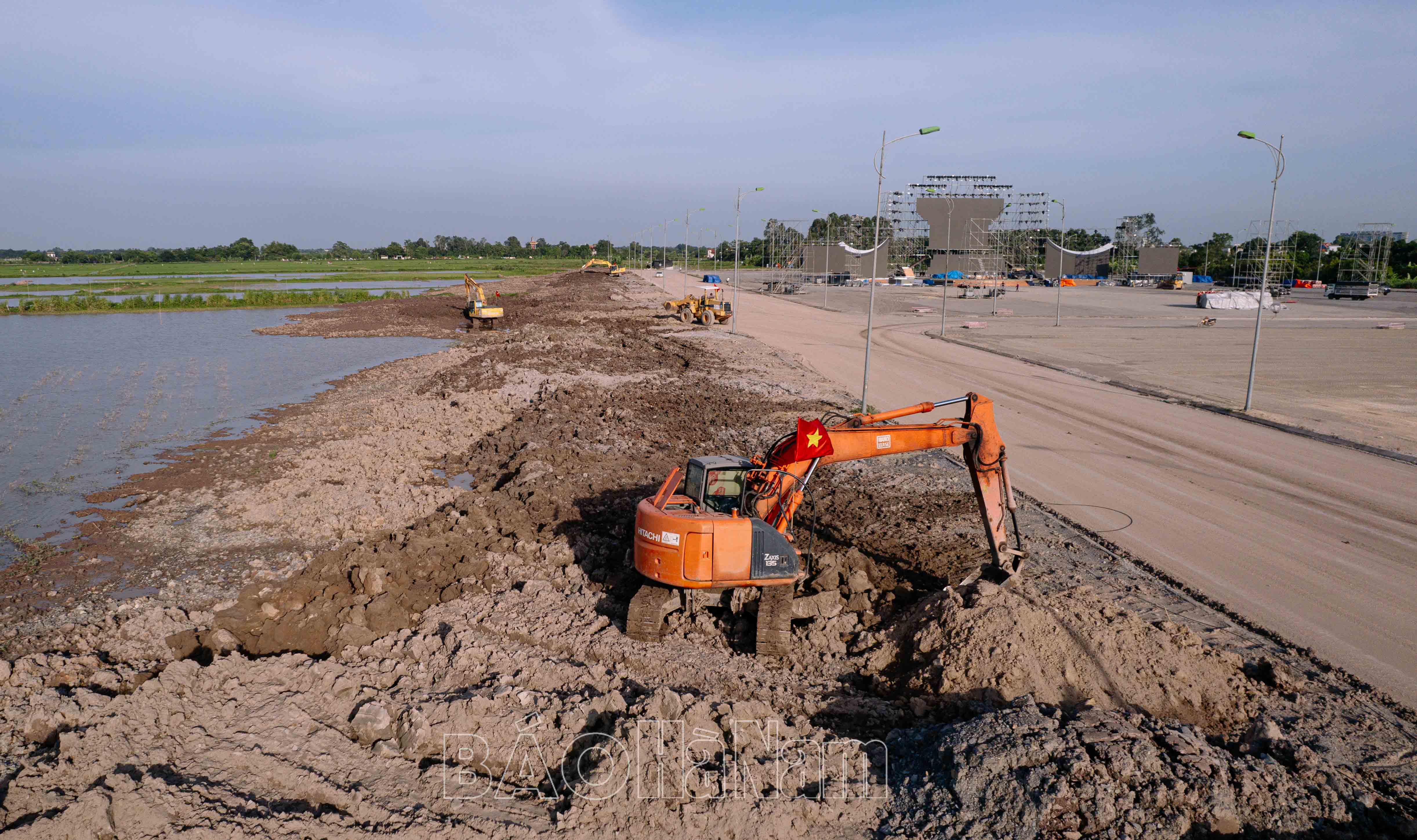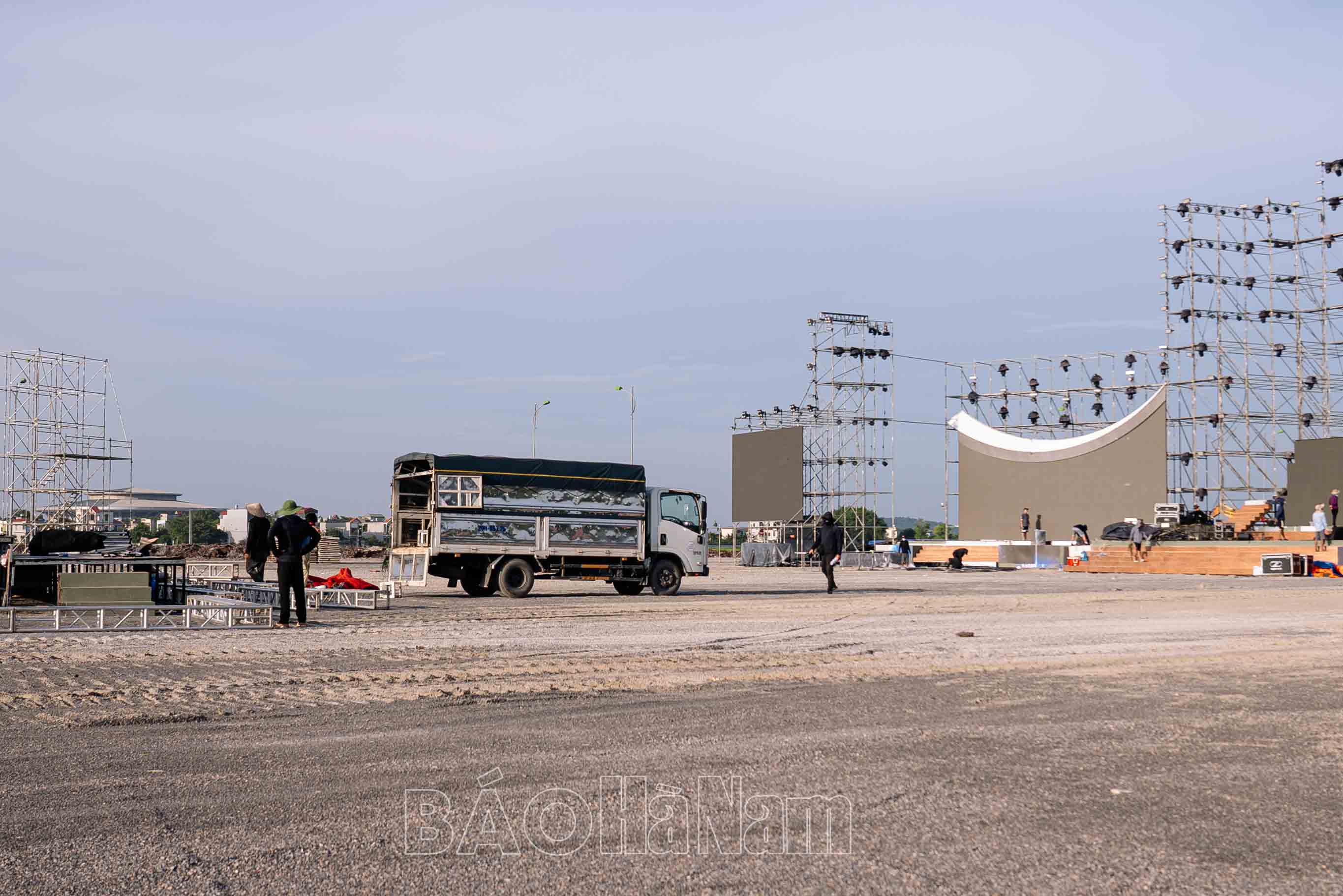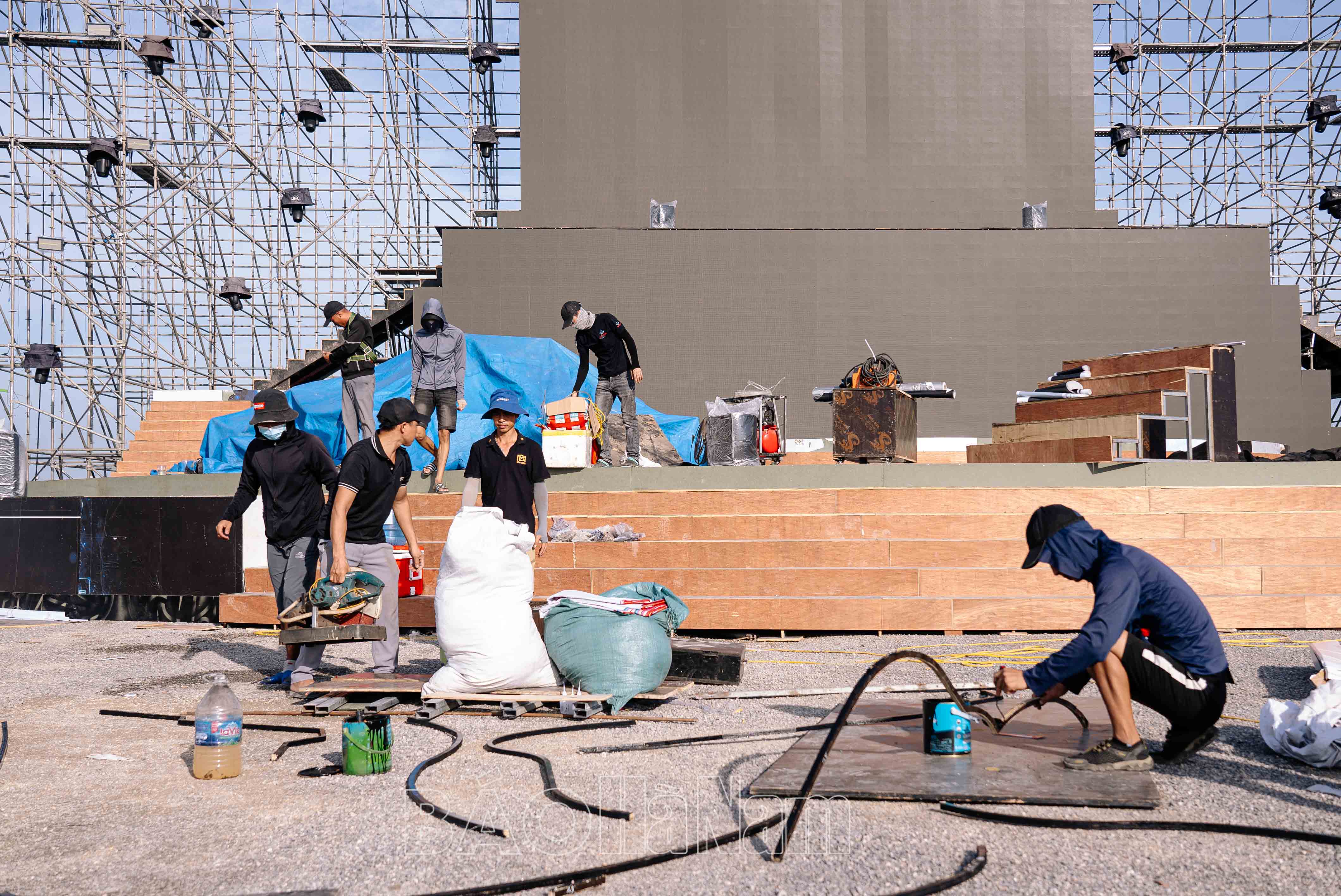 Mặc dù trong thời gian nghỉ lễ Quốc khánh 2/9, nhưng rất đông công nhân vẫn miệt mài làm việc hoàn thiện mặt bằng sân khấu.Các công đoạn lắp ghép sân khấu được thực hiện tỉ mỉ và cẩn thận.Công nhân thay phiên nhau làm việc ngày đêm 3 ca để kịp hoàn thiện sân khấu.Cải tạo hiện trường tạo mặt bằng và địa điểm dựng sân khấu.Khu vực xung quanh sân khẩu đang được san lấp đất và gấp rút hoàn thành.Công nhân thu dọn rác và vệ sinh phần vỉa hè khu vực diễn ra sự kiện.Khu vực sân khấu đến thời điểm này cơ bản đã hoàn thiện phần khung.