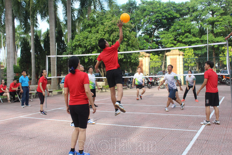 Trận thi đấu môn bóng chuyền hơi giữa đội Báo Hà Nam với đội Ban Dân vận Tỉnh ủy. Ảnh: Bình Nguyên