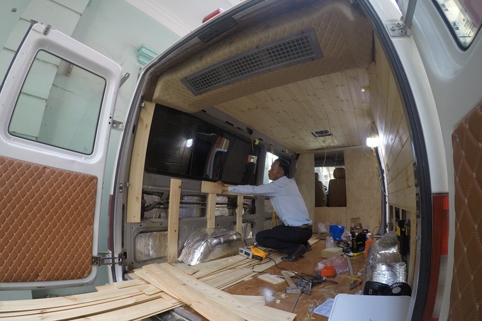 Những ngày Tết, trước cửa nhà anh Lam Sơn (34 tuổi) ngổn ngang vật liệu để thi công "ngôi nhà di động". Bố anh, người duy nhất có kiến thức xây dựng đảm nhiệm phần nội thất, anh và vợ lo những hạng mục còn lại như phối màu, làm đệm, rèm. Sau 10 ngày với nhiều lần làm đi làm lại các chi tiết, chiếc xe cũng được hoàn thiện, với đầy đủ tiện ích cơ bản như giường, tủ, bếp, bồn rửa, vòi hoa sen, máy hút mùi, hệ thống đèn chiếu sáng...