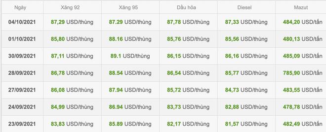 Mới đây nhất, hôm 25/9, giá xăng E5 RON 92 được điều chỉnh tăng 573 đồng/lít, xăng RON 95 tăng 548 đồng/lít. Các loại dầu cũng tăng giá, trong đó dầu diesel tăng 564 đồng/lít, dầu hỏa tăng 561 đồng/lít; dầu mazut tăng 628 đồng/kg. Sau điều chỉnh, xăng E5 RON 92 không cao hơn 20.716 đồng/lít; xăng RON 95 là 21.945 đồng/lít; dầu diesel 16.586 đồng/lít; dầu hỏa 15.643 đồng/lít, dầu mazut 16.580 đồng/kg.