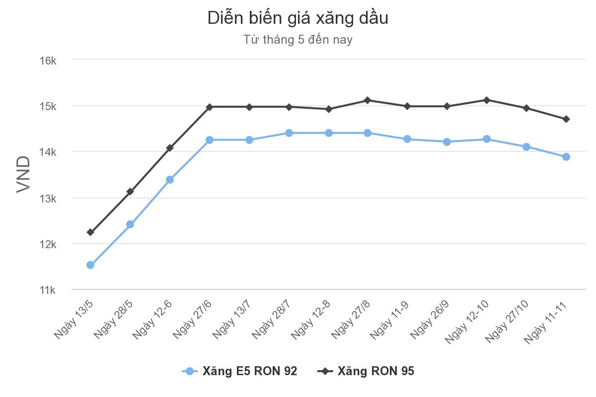 Liên Bộ Công Thương - Tài chính cho biết, với việc điều chỉnh này, giá xăng E5RON92 lên tối đa 13.885 đồng còn xăng RON95 giá cao nhất là 14.701 đồng. Giá dầu diesel giảm 380 đồng, còn 10.838 đồng một lít. Dầu hoả giảm 155 đồng một lít, còn 9.562 đồng. Dầu madut tối đa 11.091 đồng một kg, tương đương mức giảm 170 đồng.