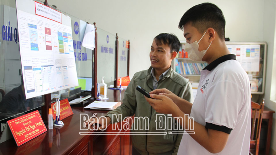 | Cán bộ xã Mỹ Tân (Mỹ Lộc) hướng dẫn người dân thực hiện dịch vụ công trực tuyến. |