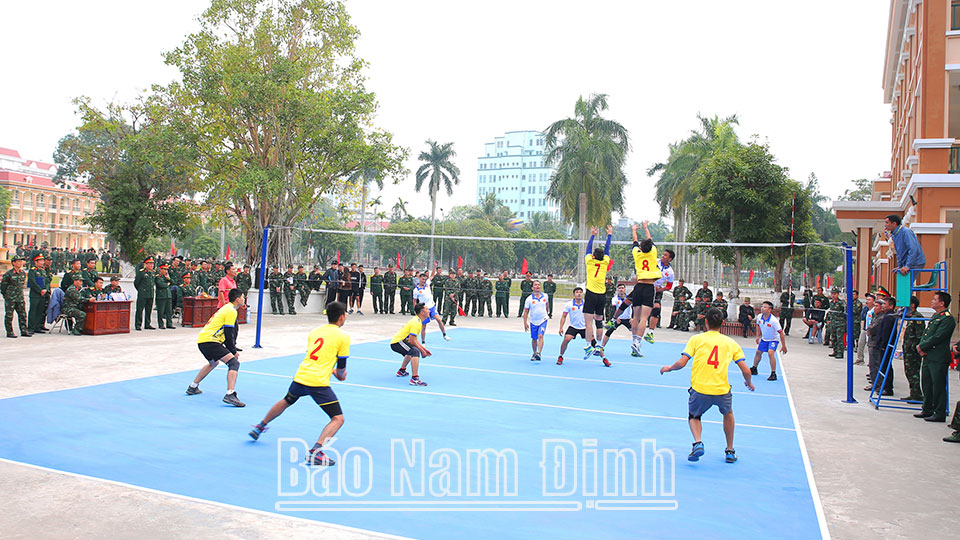 | Trận thi đấu bóng chuyền giữa đội tuyển Ban CHQS huyện Ý Yên và Phòng Tham mưu Bộ CHQS tỉnh. |