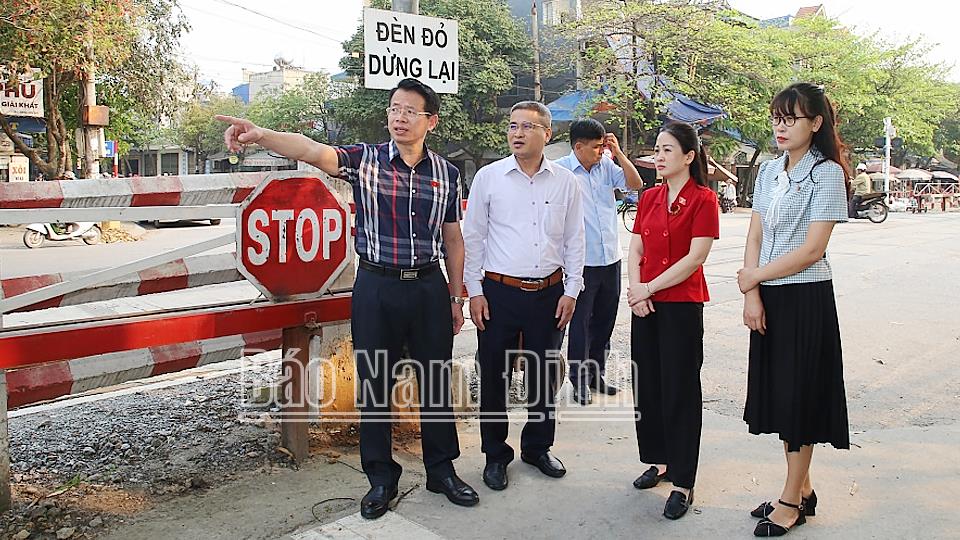 | Đồng chí Phó Trưởng đoàn chuyên trách Đoàn đại biểu Quốc hội tỉnh Nguyễn Hải Dũng và các đại biểu khảo sát công tác bảo đảm ATGT tại nút giao cắt giữa đường sắt và đường Giải phóng - Văn Cao, phường Văn Miếu (thành phố Nam Định). |