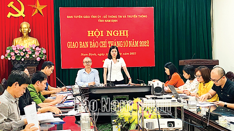 hiều 31-10, Ban Tuyên giáo Tỉnh uỷ, Sở Thông tin và Truyền thông phối hợp tổ chức giao ban công tác báo chí tháng 10-2022. Đồng chí Phạm Thị Thu Hằng, Uỷ viên Ban TVTU, Trưởng Ban Tuyên giáo Tỉnh uỷ chủ trì hội nghị.