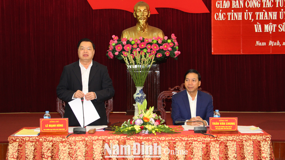 Sáng 28-11, tại Thành phố Nam Định, Ban Tuyên giáo Trung ương phối hợp với Tỉnh ủy Nam Định tổ chức hội nghị giao ban công tác tuyên giáo 6 tháng cuối năm 2018 các tỉnh uỷ, thành ủy khu vực đồng bằng sông Hồng và một số tỉnh Đông Bắc Bộ. Các đồng chí: Lê Mạnh Hùng, Phó trưởng Ban Tuyên giáo Trung ương; Trần Văn Chung, Phó Bí thư Thường trực Tỉnh ủy, Chủ tịch HĐND tỉnh chủ trì hội nghị. Dự hội nghị có lãnh đạo các vụ, cơ quan thuộc Ban Tuyên giáo Trung ương; đồng chí Phạm Thị Thu Hằng, Ủy viên Ban TVTU, Trưởng Ban Tuyên giáo Tỉnh ủy, lãnh đạo Ban Tuyên giáo các tỉnh, thành ủy trong khu vực đồng bằng sông Hồng và một số tỉnh Đông Bắc Bộ.
