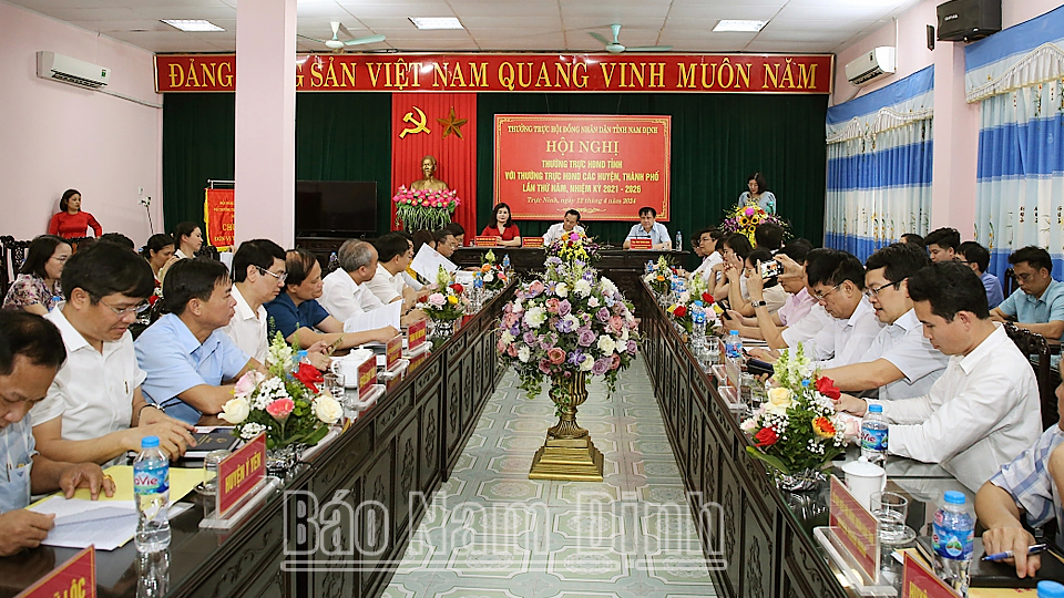 Chiều 12-4, tại huyện Trực Ninh, Thường trực HĐND tỉnh tổ chức hội nghị giao ban với Thường trực HĐND các huyện, thành phố lần thứ 5, nhiệm kỳ 2021-2026. Dự hội nghị có các đồng chí: Nguyễn Phùng Hoan, Ủy viên Ban TVTU, Phó Chủ tịch Thường trực HĐND tỉnh; Mai Thanh Long, TUV, Phó Chủ tịch HĐND tỉnh; Hà Lan Anh, TUV, Phó Chủ tịch UBND tỉnh; Thường trực Ủy ban MTTQ tỉnh; lãnh đạo các Ban, các Tổ đại biểu HĐND tỉnh và HĐND các huyện, thành phố.