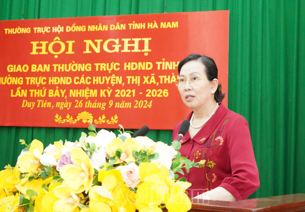 Phát biểu kết luận hội nghị, đồng chí Bí thư Tỉnh ủy, Chủ tịch HĐND tỉnh Lê Thị Thủy nhấn mạnh một số nhiệm vụ trọng tâm trong thời gian tới. Trong đó, đề nghị các cơ quan, địa phương, đơn vị tập trung giải pháp nâng cao chất lượng, hiệu quả hoạt động, kịp thời khắc phục tồn tại, hạn chế đã được chỉ ra. Tăng cường phối hợp, tổ chức thực hiện các nghị quyết của HĐND tỉnh, HĐND các huyện, thị xã, thành phố đã ban hành, nhất là các nghị quyết về nhiệm vụ phát triển kinh tế - xã hội, thu - chi ngân sách, cơ chế, chính sách, dự án đầu tư công, dự án thu hồi, chuyển mục đích sử dụng đất… bảo đảm mục tiêu, kế hoạch đề ra. Thường trực HĐND, các Ban HĐND, tổ đại biểu và đại biểu HĐND tiếp tục nâng cao chất lượng, hiệu quả hoạt động giám sát, đôn đốc, theo dõi việc thực hiện các thông báo kết luận sau giám sát, tăng cường hoạt động giám sát thường xuyên, bảo đảm việc tuân thủ pháp luật trên địa bàn tỉnh; đôn đốc, giám sát việc giải quyết các ý kiến, kiến nghị của cử tri, nhất là các kiến nghị liên quan đến chất lượng cung cấp nước sạch; việc cấp Giấy chứng nhận quyền sử dụng đất; xử lý ô nhiễm môi trường, rác thải, nước thải; hạ tầng giao thông…