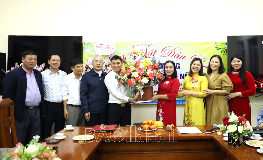 Các đại biểu tặng hoa chúc mừng Ban Giám hiệu nhà trường.