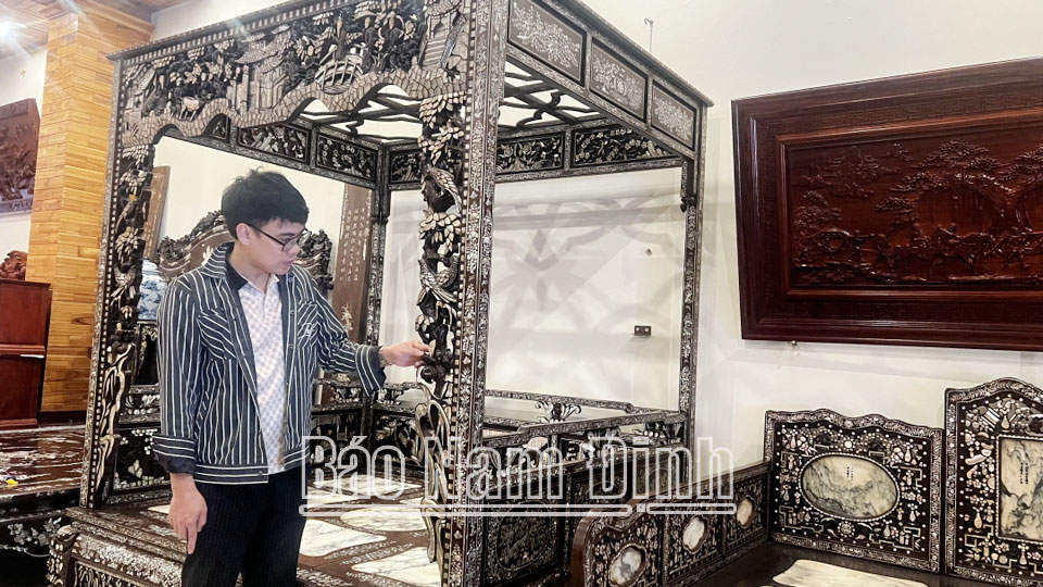 | Anh Ninh Văn Nguyên, thôn La Xuyên giới thiệu các sản phẩm khảm trai, ốc giá trị do anh và những người thợ dày công chạm khảm. |
