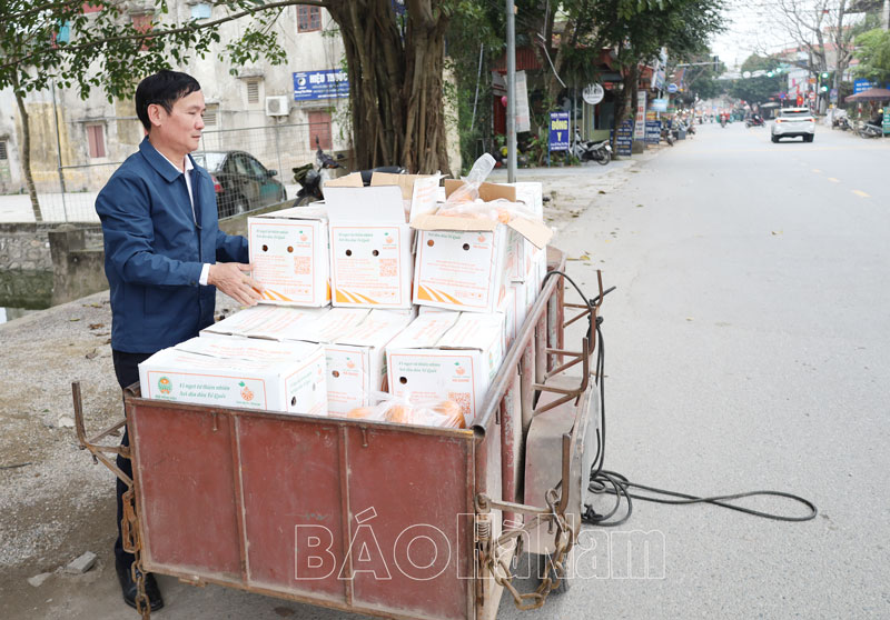 Lãnh đạo Hội Nông dân tỉnh và Hội Nông dân huyện Lý Nhân giới thiệu, quảng bá kết nối sản phẩm giữa 2 tỉnh Hà Giang - Hà Nam.Cửa hàng trưng bày, giới thiệu, quảng bá và tiêu thụ sản phẩm cam sành Hà Giang tại thị trấn Vĩnh Trụ (Lý Nhân).