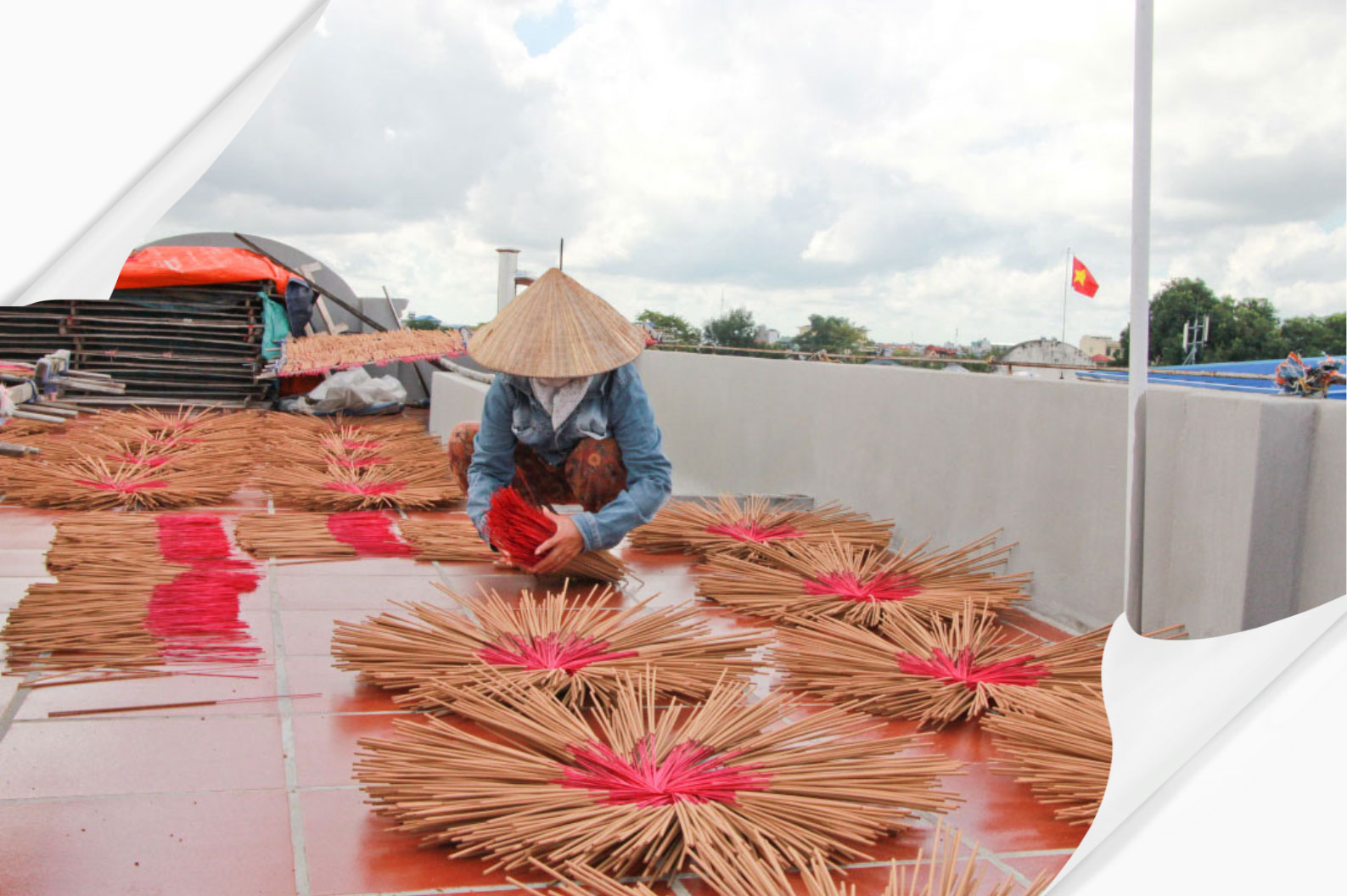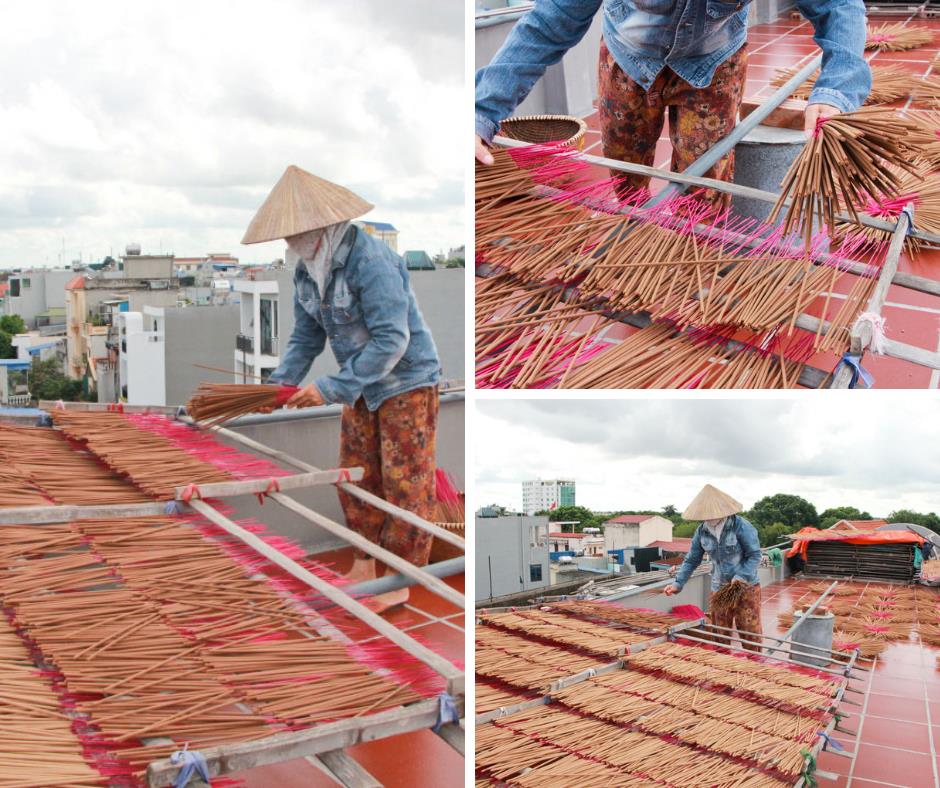 Để làm ra mẻ hương đạt tiêu chuẩn còn phải kể đến công đoạn phơi. Trong đó nắng tự nhiên luôn là ánh sáng hoàn hảo nhất cho những mẻ hương tốt. Chỉ khi thời tiết âm u kéo dài mới phải đem hương vào lò sấy. Thường người làm nghề không ai muốn chọn cách này, vì sẽ làm giảm đi mùi thơm đặc trưng của hương. Hiện nay, tuy đã có máy móc làm trong nhiều công đoạn nhưng gia đình bà Xuyến vẫn chọn cách phơi nắng tự nhiên. Vì vậy, bà chỉ tập trung làm trong 5-6 tháng hè thu. Nghề hương truyền thống, ngoài việc phụ thuộc hoàn toàn vào thời tiết còn đòi hỏi tính tỉ mỉ, cận trọng, chính xác trong từng công đoạn từ phối, chế nguyên liệu, nghiền thành bột rồi đến các khâu “nhúng”, “vê”.