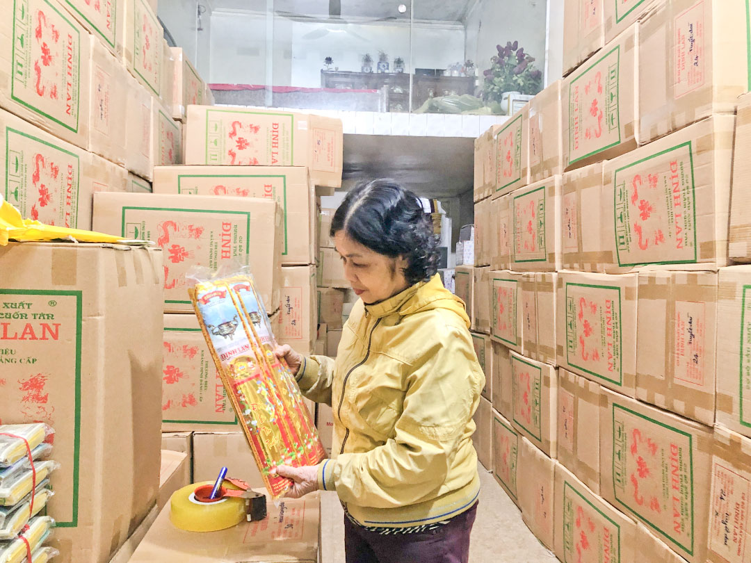 Gia đình bà Lê Thị Xuyến ở phố Minh Khai tiếp nối nghề làm hương từ gia đình từ những năm 1980. Hương của gia đình bà được làm hoàn toàn bằng những nguyên liệu thảo mộc tự nhiên nên có mùi hương đặc trưng và không gây hại cho người dùng. Trước đây, do thị trường ưa chuộng hương truyền thống nên việc làm hương của gia đình bà rất ổn định, làm quanh năm. Ngoài những thành viên trong gia đình còn luôn có 3-4 người làm, cho thu nhập ổn định. Bà Xuyến cho biết: “Ở khu phố tôi ở có nhiều nhà làm hương truyền thống và các công đoạn làm hương thì đều giống nhau, từ phơi khô, nghiền thảo mộc, sau đó pha chế hương liệu. Tuy nhiên việc pha chế hương liệu chính là mấu chốt của quy trình làm, tạo sự khác biệt, đặc trưng của từng hộ sản xuất. Nên việc làm các công đoạn khác có thể có nhiều người làm, nhưng việc pha chế chỉ có một người duy nhất, thường là chủ hộ. Công thức này sẽ được trao truyền cho thế hệ kế tiếp trong gia đình để giữ bí quyết riêng”.