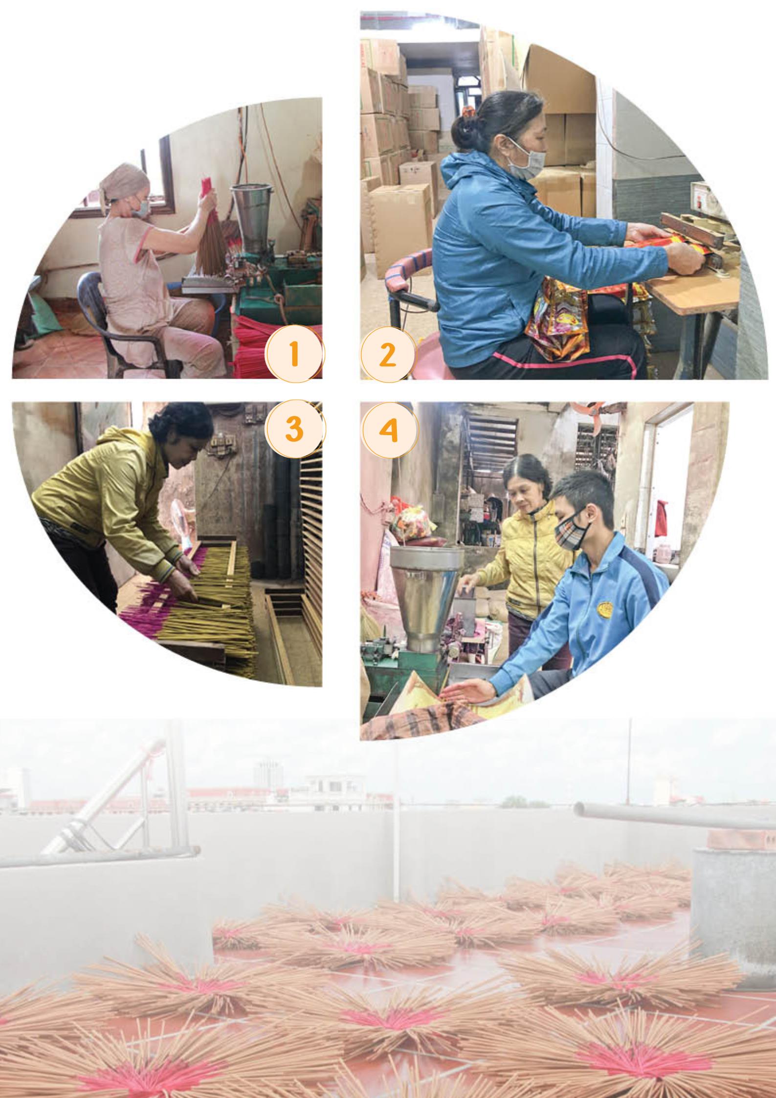 | | 1. Với sự phát triển của khoa học kỹ thuật, nhiều công đoạn đã được máy móc thay thế. 2. Công đoạn đóng gói sản phẩm. 3. Những ngày thời tiết nồm ẩm, mưa rét, các cơ sở sản xuất hương phải dùng lò sấy hương. 4. Các nguyên liệu được lựa chọn kỹ càng và pha trộn theo tỷ lệ nhất định. |