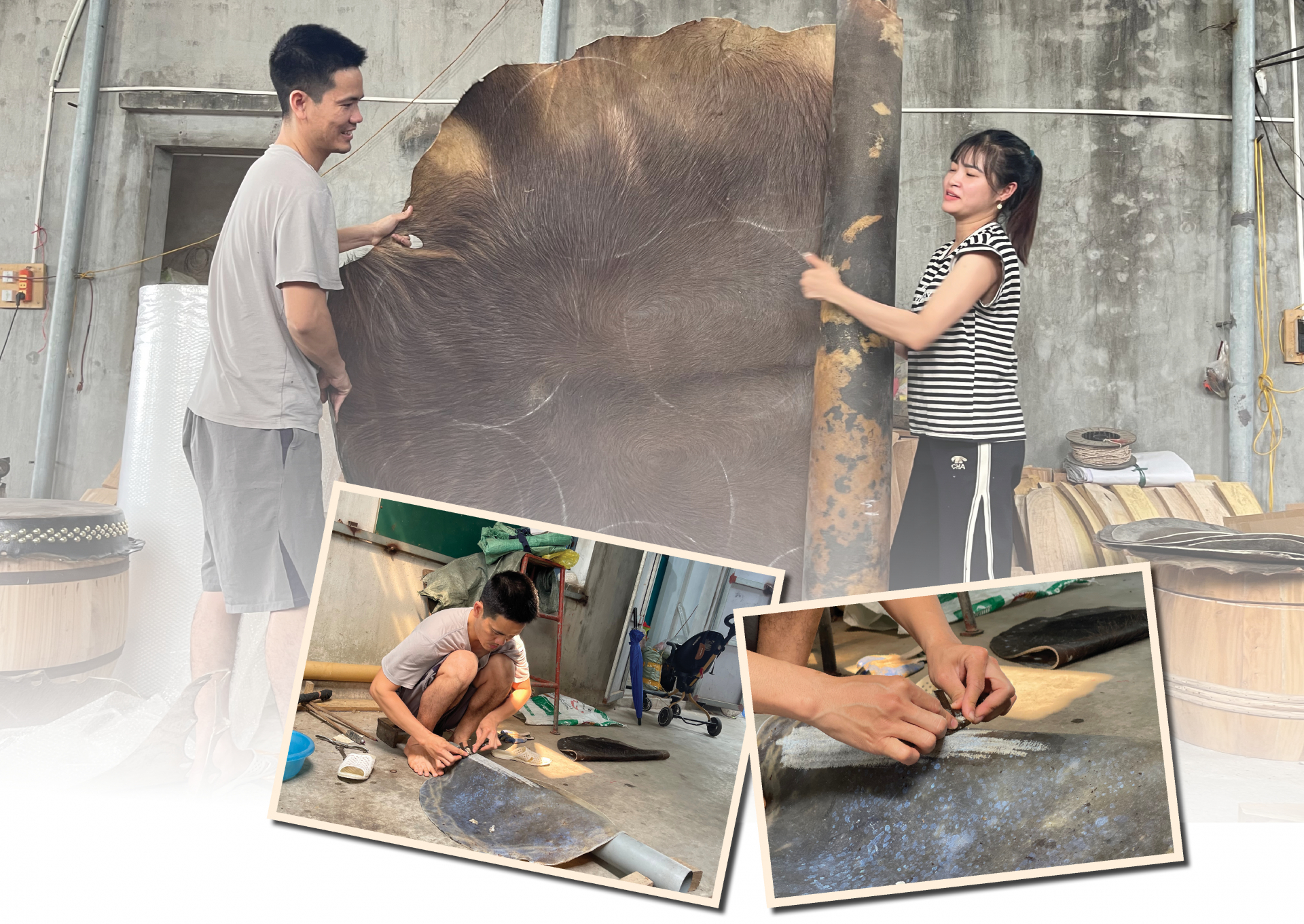 | Đo kích thước da trâu phù hợp với mặt trống. |