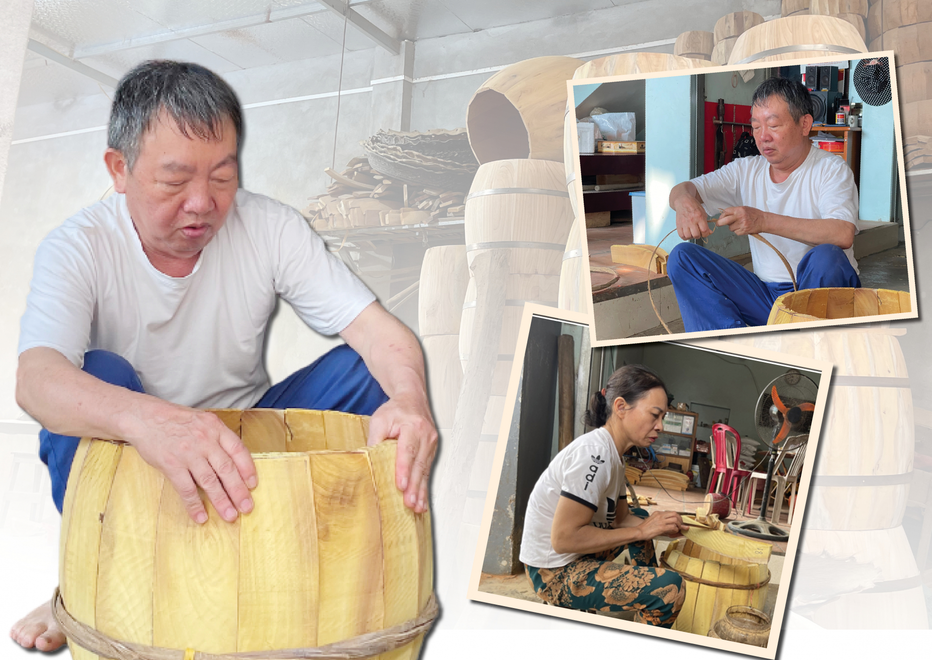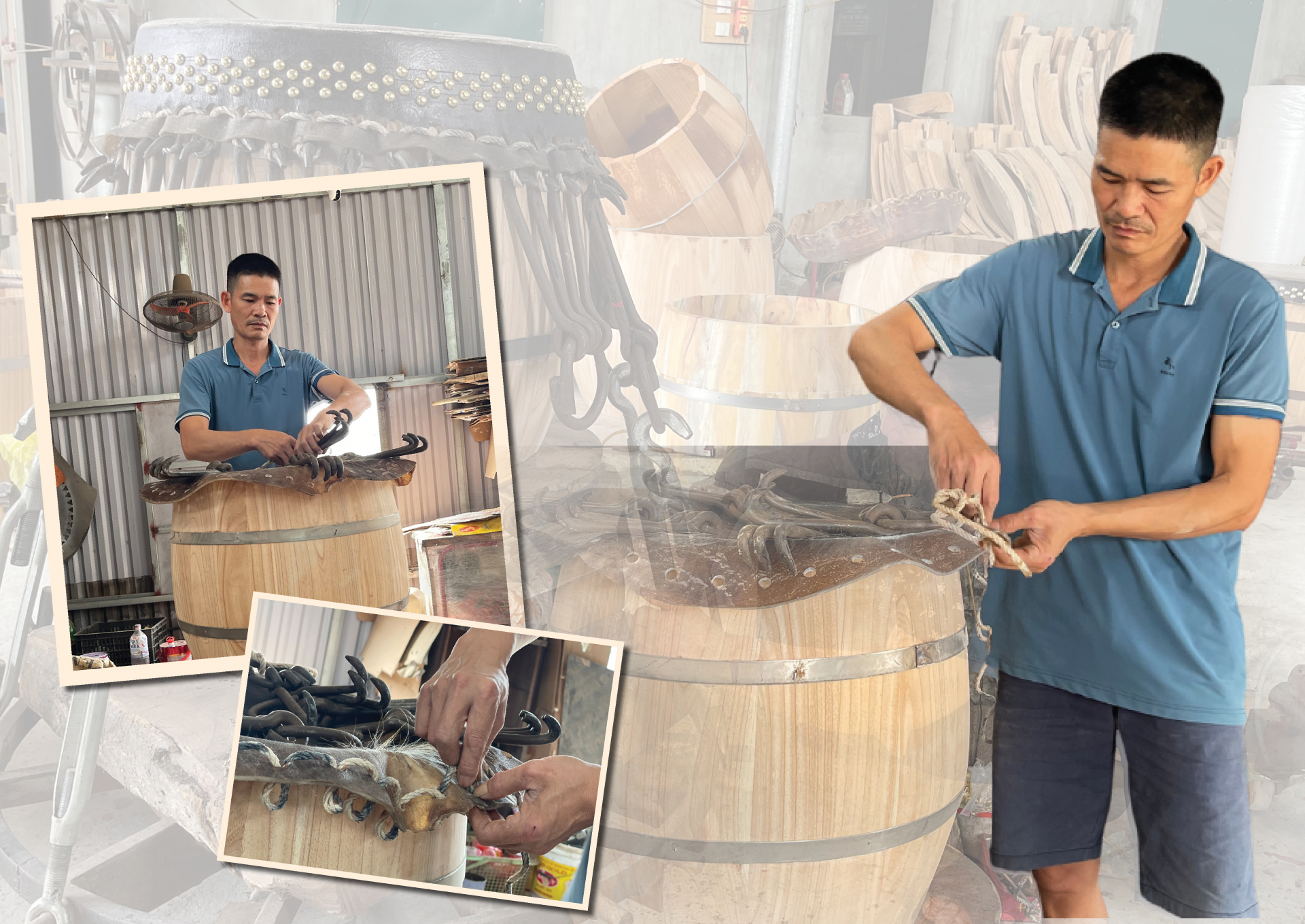 | Người thợ làm trống sẽ làm cho các dăm gắn kết lại với nhau bằng keo sữa. |