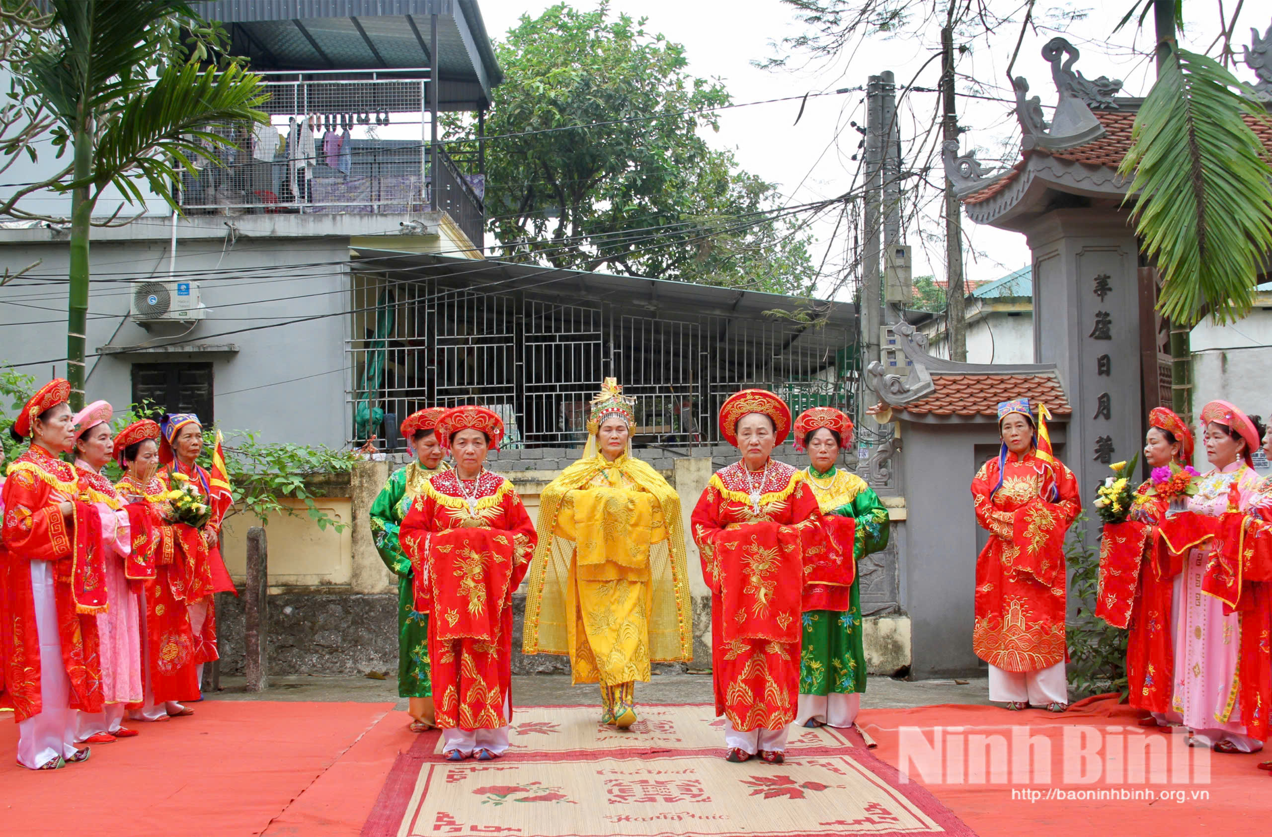 Các thành viên đội tế lễ truyền thống tổ dân phố Trường Sơn, phường Tây Hoa Lư tập luyện nghi lễ tế Cửu Khúc.
