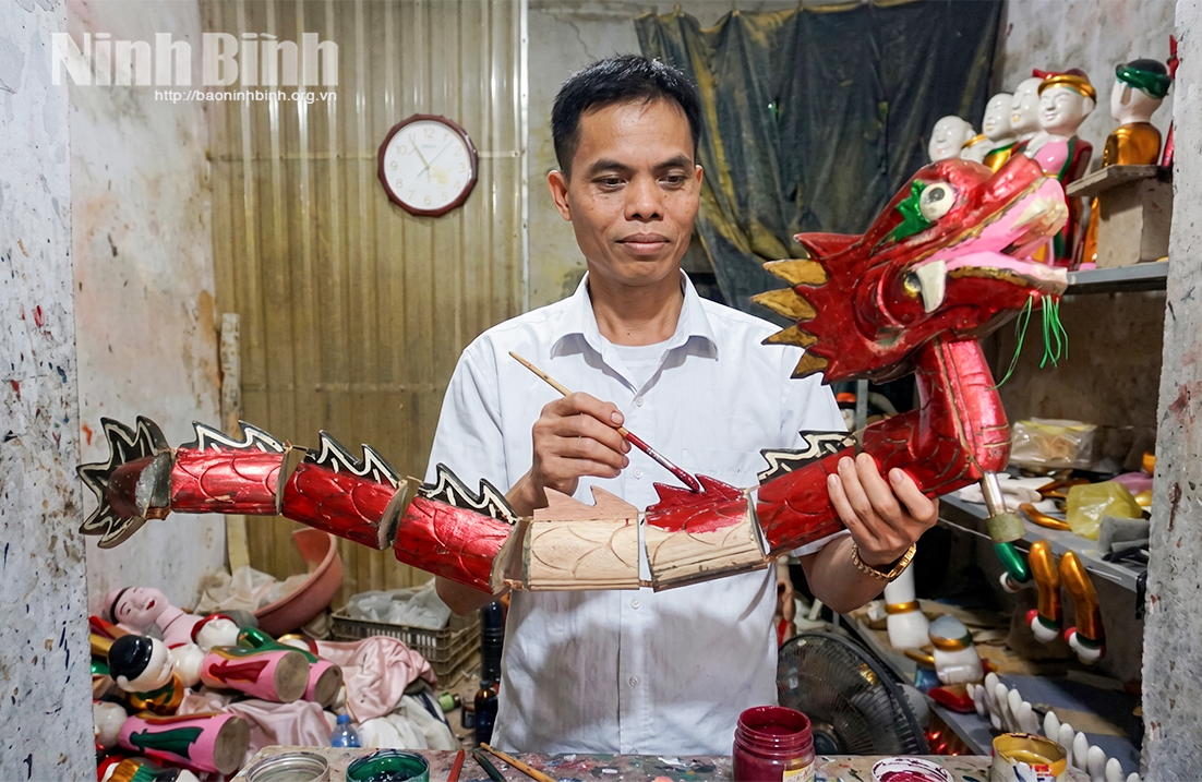 Ông Phan Văn Triển, TDP Bàn Thạch, phường Hồng Quang đang hoàn thiện con trò rối rồng. Ảnh: Viết Dư