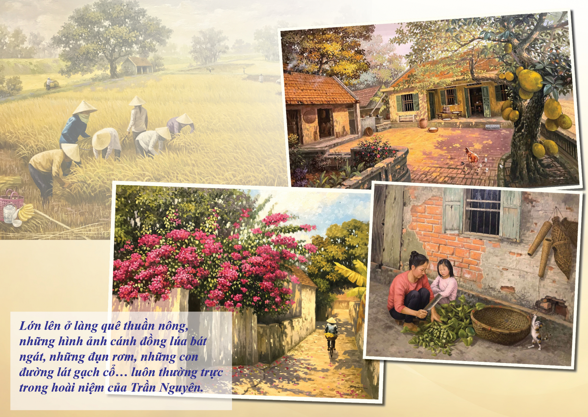 Lớn lên ở làng quê thuần nông, những hình ảnh cánh đồng lúa bát ngát, những đụn rơm, những con đường lát gạch cổ… luôn thường trực trong hoài niệm của Trần Nguyên. Từ năm 2017 đến nay, họa sĩ Trần Nguyên đã sáng tác trên 150 bức tranh về chủ đề làng quê Bắc Bộ. Trong các tác phẩm của Nguyên, luôn có không gian văn hóa làng đặc trưng. Đó là những con đường làng nhỏ, cây đa cổ thụ, đụn rơm… các nhân vật với trang phục thôn quê gần gũi… những con vật như đàn gà, chó, mèo… Họa sĩ Trần Nguyên cho biết thêm: “Những hình ảnh thôn quê hiện nay đang dần mai một, tôi muốn tái hiện lại để thế hệ trẻ thời nay được tiếp cận nét đẹp văn hoá xưa. Tôi mong muốn những người đã trải qua cuộc sống làng quê cũng có thể tìm về bầu trời tuổi thơ của mình”. Khi bắt tay vào sáng tác, khó khăn nhất với Nguyên là các kiến trúc cổ ở nhiều nơi không còn nguyên trạng. Để vẽ ra “hồn quê”, Nguyên nhớ lại khung cảnh chính quê hương mình, dùng những kiến thức về lịch sử mỹ thuật điện ảnh, nghiên cứu tài liệu, khảo sát thực tế để sáng tác bức tranh hội tụ đầy đủ 3 yếu tố “Chân, Thiện, Mỹ” và đúng với thời kỳ lịch sử. Các bức tranh của họa sĩ Trần Nguyên sử dụng chất liệu sơn dầu và màu Acrylic, với lối vẽ tả thực kết hợp tông màu vàng trầm ấm tạo nên khung cảnh bình dị của làng quê, tiêu biểu là các tác phẩm “Chợ quê”, “Dưới mái hiên nhà”, “Chiều quê”, “Hoài niệm”, “Khoảng sân trước nhà”… Điểm chung trong các bức tranh của họa sĩ Trần Nguyên là đều có nắng tượng trưng cho niềm tin và hy vọng; những tia nắng như nhịp cầu kết nối mạch nguồn quá khứ với hiện tại và hướng tới tương lai tươi sáng.
