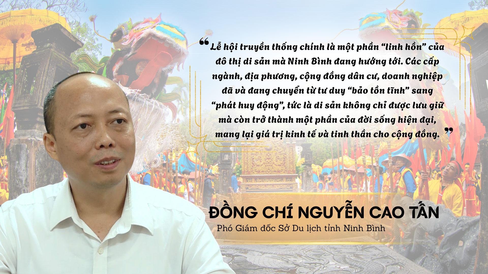 Thực hiện mục tiêu chiến lược đưa tỉnh phát triển nhanh và bền vững, đưa du lịch và công nghiệp văn hóa trở thành cụm ngành kinh tế mũi nhọn, Ninh Bình đang hiện thực hóa các nghị quyết của Đảng về văn hóa bằng một lộ trình bài bản, đưa tỉnh trở thành hình mẫu về phát triển bền vững dựa trên các giá trị di sản. Khi lễ hội được đặt đúng vị trí trong dòng chảy của chiến lược phát triển văn hóa quốc gia, nó sẽ trở thành động lực mạnh mẽ đưa Ninh Bình trở thành trung tâm du lịch, văn hóa hàng đầu, xứng tầm với bề dày lịch sử ngàn năm của dân tộc. Giữ mạch nguồn di sản ấy chính là giữ lấy “căn cước” của dân tộc để tự tin vững bước vào kỷ nguyên mới, kỷ nguyên của sự phát triển hài hòa, nhân văn và bền vững.