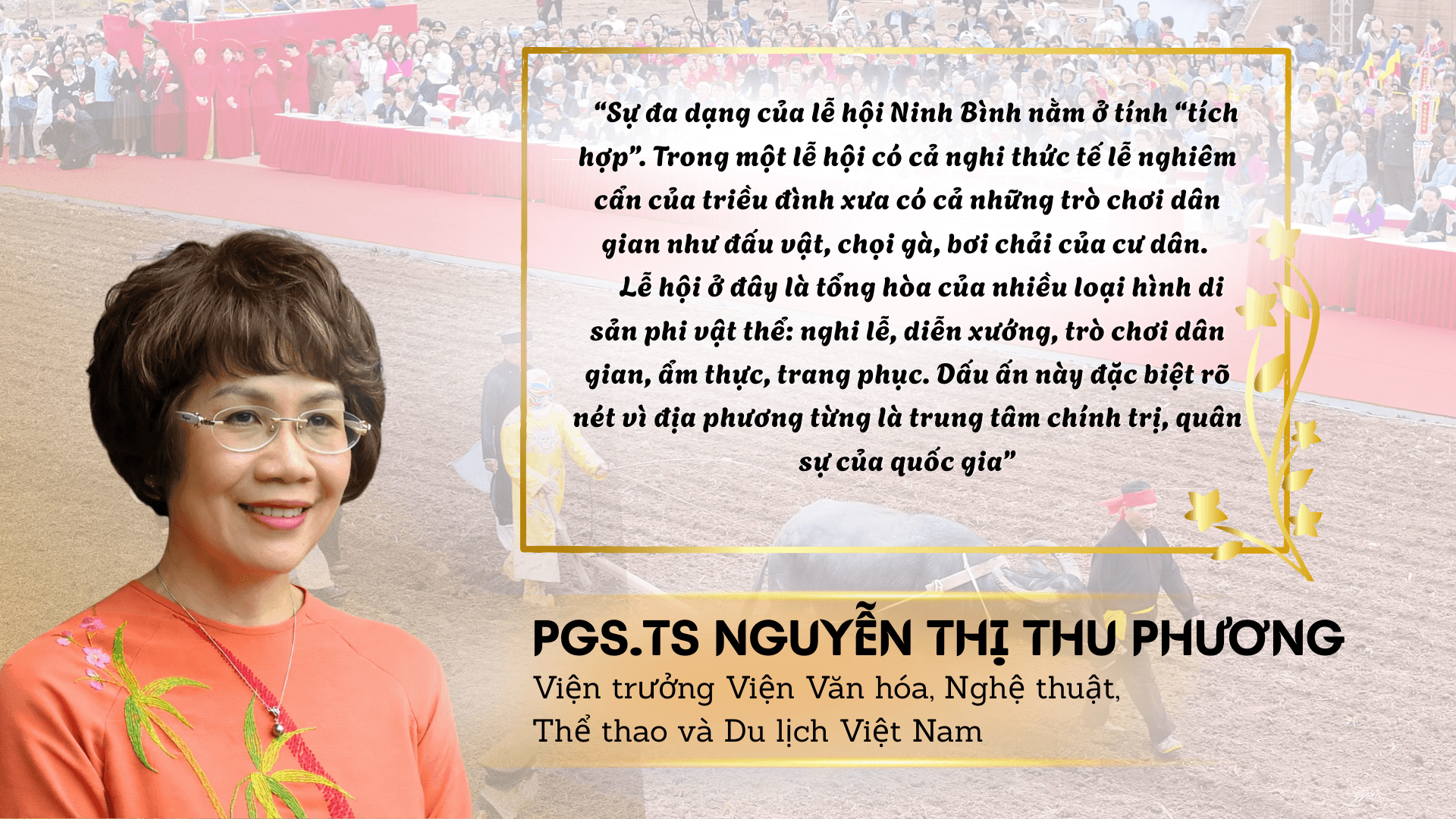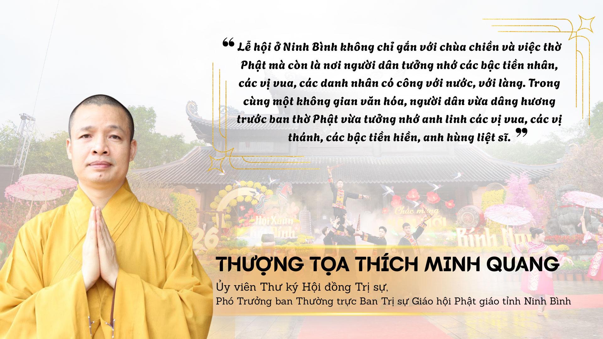 Sự đa sắc này, so sánh như PGS.TS Nguyễn Thị Thu Phương thì chính là “mã gen” làm nên bản sắc văn hóa rất riêng của vùng đất Cố đô. Nếu nhìn theo chiều dọc lịch sử, các lễ hội ở Ninh Bình phản ánh một tiến trình gần như đầy đủ của quốc gia độc lập, tự chủ: từ thời Đinh - Tiền Lê - Lý dựng lên nhà nước phong kiến trung ương tập quyền đầu tiên ở Việt Nam, đến thời Trần củng cố quốc gia, phát triển văn hóa, rồi sự tiếp nối của tín ngưỡng dân gian và Phật giáo qua nhiều thế kỷ. Nếu nhìn theo chiều ngang văn hóa, đó là sự giao thoa giữa tín ngưỡng thờ vua, thờ thành hoàng - thờ Phật - thờ các vị thần bản địa - thờ danh nhân, anh hùng liệt sỹ.
