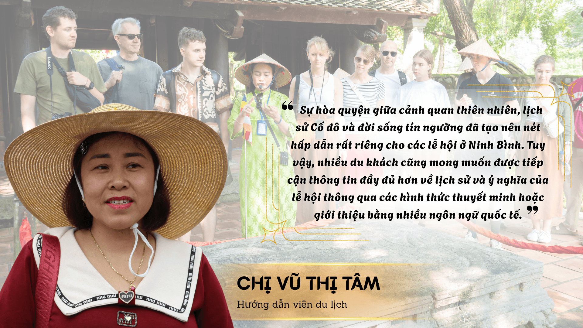 Chị Vũ Thị Tâm, hướng dẫn viên du lịch tại Hà Nội, người có nhiều năm dẫn các tour “du lịch tâm linh” tại Ninh Bình cho biết: “Khách quốc tế bây giờ họ không thích các chương trình dàn dựng kiểu công nghiệp mà muốn vừa ngắm cảnh, vừa muốn trải nghiệm không gian văn hóa tại vùng đất họ đến. Khi tham gia các lễ hội ở Ninh Bình, họ rất thích thú tìm hiểu về ý nghĩa của nghi thức rước kiệu, về việc người dân tưởng nhớ các vị vua và danh nhân. Điều khiến họ ấn tượng nhất là lễ hội không phải là một buổi biểu diễn được dàn dựng, mà là sinh hoạt văn hóa thực sự của cộng đồng”.