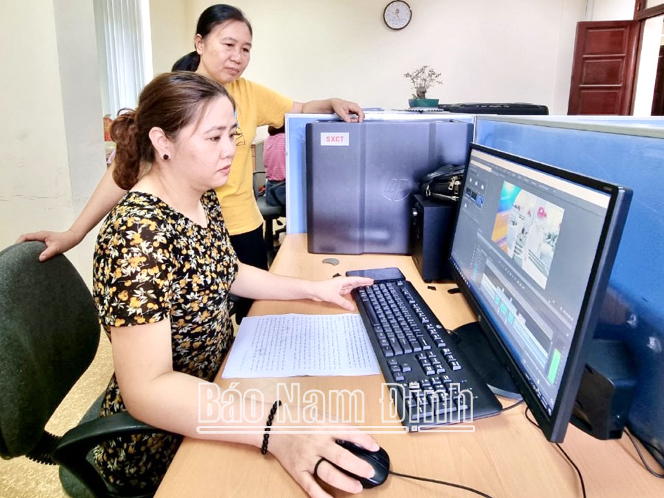 | Kỹ thuật viên, biên tập viên Đài Phát thanh - Truyền hình Nam Định dựng tác phẩm báo chí tuyên truyền về thu hút, đầu tư các dự án trọng điểm của tỉnh. |